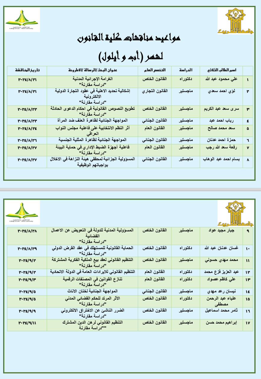 مواعيد مناقشات كلية القانون لشهر آب وايلول