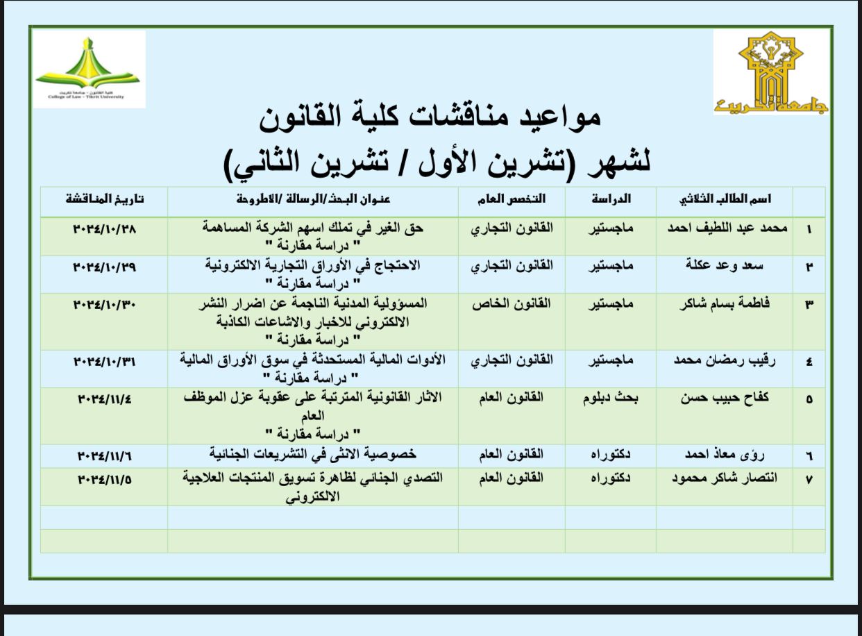 مواعيد مناقشات كلية القانون لشهر (تشرين الاول/ تشرين الثاني)