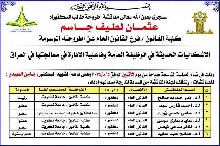 🔴ستجرى بعون الله مناقشة اطروحة الدكتوراه للطالب "عثمان لطيف جاسم" عن اطروحتهِ الموسومة"الاشكاليات الحديثة في الوظيفة العامة وفاعلية الإدارة في معالجتها في العراق" صباح يوم الأثنين الموافق 5-8-2024 وعلى قاعة الشعيد الدكتور ضامن العبيدي.. شعبة الإعلام والا