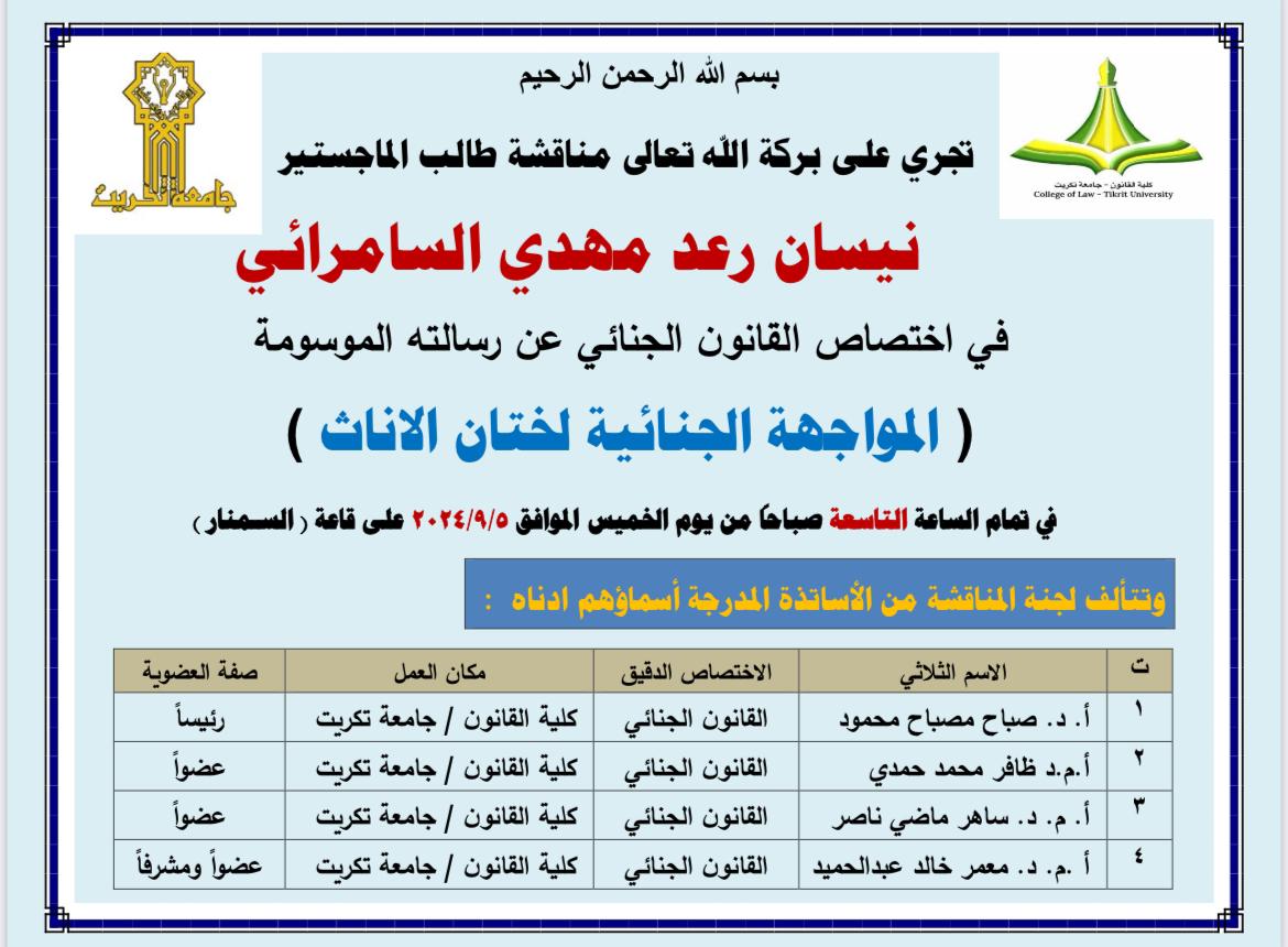 ستجرى بعون الله مناقشة رسالة ماجستير للطالب"نيسان رعد مهدي السامرائي"..