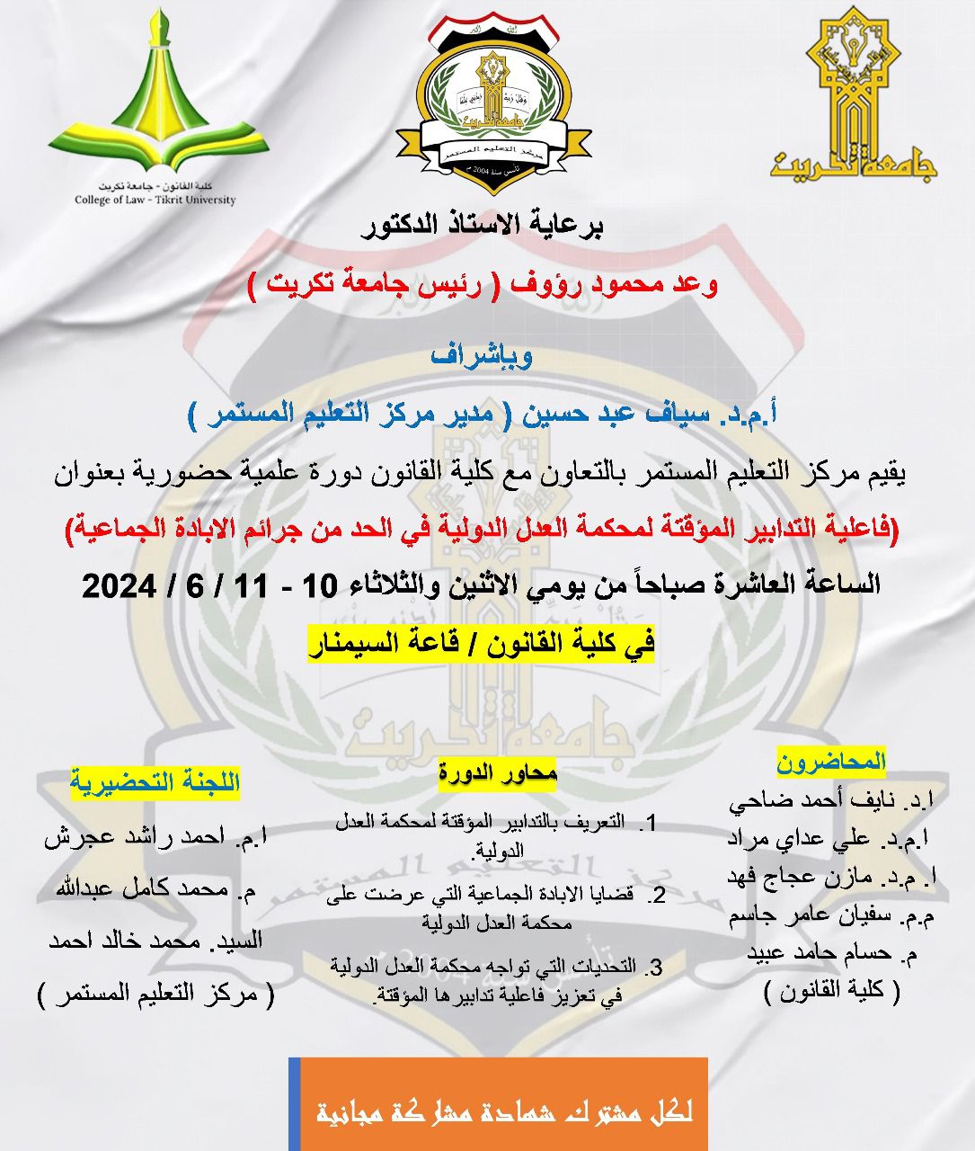 برعاية السيد رئيس جامعة تكريت الاستاذ الدكتور وعد محمود رؤوف ، وبأشراف كلاً من الاستاذ الدكتور وعد محمود رؤوف/ عميد كلية القانون ، و الاستاذ المساعد الدكتور سیاف عبد حسین / مدير مركز التعليم المستمر اقامت كلية القانون دورة علمية حضورية بعنوان ( فاعلية التدابير المؤقتة لمحكمة العدل الدولية في الحد من جرائم الابادة الجماعية ) وذلك بالتعاون مع مركز التعليم المستمر يوم الاثنين الموافق 10-6-2024 على قاعة السيمنارفي مبنى الكلية في تمام الساعة العاشرة صباحآ.