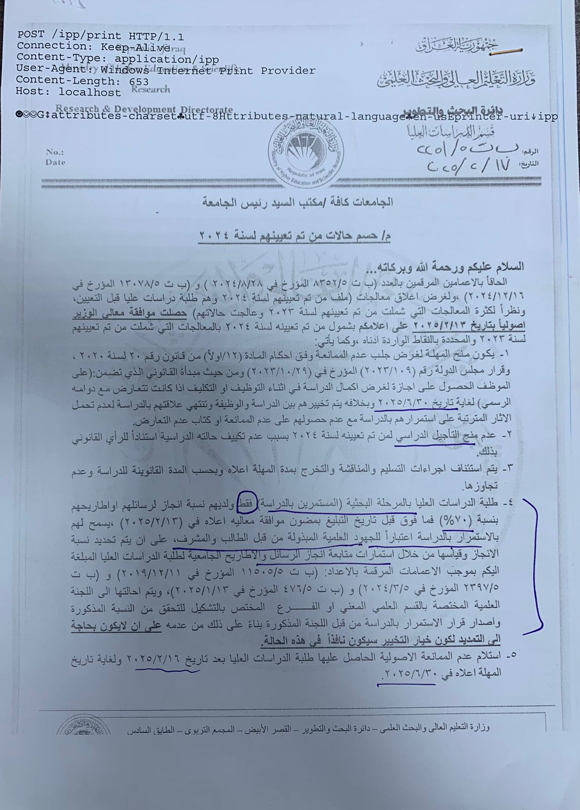 اشارة الى كتاب وزارة التعليم العالي والبحث العلمي ذي العدد (ب ت ٢٢٥١/٥ في ١٧/٢/٢٠٢٥) المتضمن حسم حالات طلبة الدراسات العليا من المعينيين لسنة ٢٠٢٤ ،راجين من طلبة الدراسات العليا الذين تم تعيينهم جلب كتاب عدم ممانعة للكلية علماً ان اخر موعد هو (٣٠/٦/٢٠٢٥) بخلاف ذلك يتم تخيير الطالب بين (الوظيفة او الدراسة) وتنتهي علاقتهم بالدراسة لعدم تحمل الاثار المترتبة على استمرارهم بالدراسة مع عدم حصولهم على عدم الممانعة او كتاب عدم التعارض كما هو مبين في كتاب الوزارة ادناه .