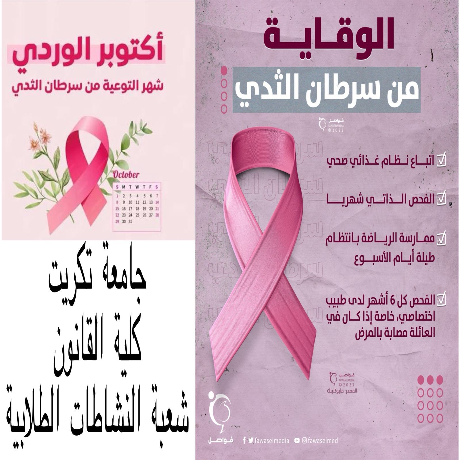 في إطار شهر التوعية بسرطان الثدي، نظّمت كلية القانون - جامعة تكريت /شعبة النشاطات الطلابية صباح يوم الثلاثاء الموافق 28-10-2025 حملة توعوية بعنوان ( اكتوبر الوردي شهر التوعية ) تهدف إلى نشر الوعي الصحي بين النساء وتشجيع الكشف المبكر عن سرطان الثدي، لما له من أهمية كبيرة في الوقاية والعلاج المبكر ،تضمنت الحملة توزيع بروشورات تثقيفية وملصقات توعوية، تعريفية حول طرق الفحص الذاتي، وأهمية الكشف الدوري، والعوامل التي تزيد من احتمالية الإصابة، فضلاً عن التأكيد على أن الكشف المبكر يسهم بشكل كبير في رفع نسب الشفاء وتقليل المضاعفات ،وأكدت القائمة على الحملة أن هذه المبادرة تأتي انسجاماً مع رسالة الكلية في تعزيز ثقافة الوعي الصحي والمسؤولية المجتمعية بين الطالبات ومنتسبات الجامعة، وتسليط الضوء على دور المرأة في الاهتمام بصحتها وصحة أسرتها ،وقد شهدت الحملة تفاعلاً إيجابياً من قبل الطالبات وأعضاء الهيئة التدريسية، الذين أشادوا بأهمية الموضوع وضرورة الاستمرار في إقامة مثل هذه الأنشطة التوعوية، التي تسهم في بناء ثقافة صحية مستدامة داخل الحرم الجامعي والمجتمع. وفي ختام الحملة، وجّهت وحدة شؤون المرأة و وحدة شؤون المرأة ذات الإعاقة دعوة لجميع النساء إلى إجراء الفحص الدوري لسرطان الثدي، ومراجعة المراكز الصحية المختصة بشكل منتظم، مؤكدين أن الوقاية والكشف المبكر هما السبيل الأمثل للحفاظ على الصحة والحد من انتشار المرض.