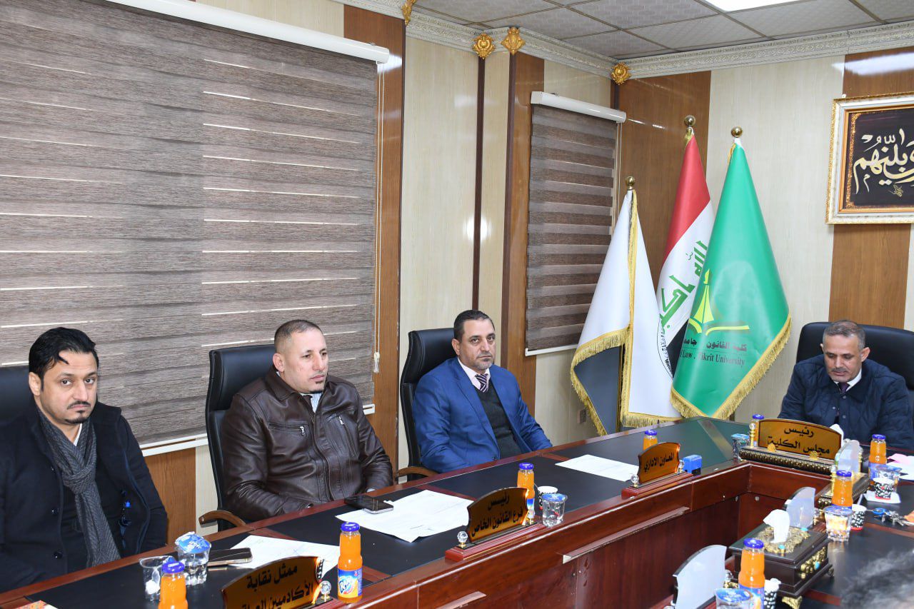 عقد مجلس كلية القانون – جامعة تكريت صباح يوم الاثنين الموافق 15-12-2025 جلسته السابعةبرئاسة السيد عميد الكلية أ.د. نايف احمد ضاحي وبحضور السادة أعضاء المجلس كافة، حيث جرى خلال الجلسة مناقشة عدد من القضايا الأكاديمية والإدارية المدرجة على جدول الأعمال، واختُتمت الجلسة بتوجيه السيد العميد شكره للسادة الأعضاء؛ لما أبدوه من ملاحظات قيّمة ومقترحات بنّاءة تخدم مسيرة الكلية وتسهم في الارتقاء بمستوى الأداء الأكاديمي.