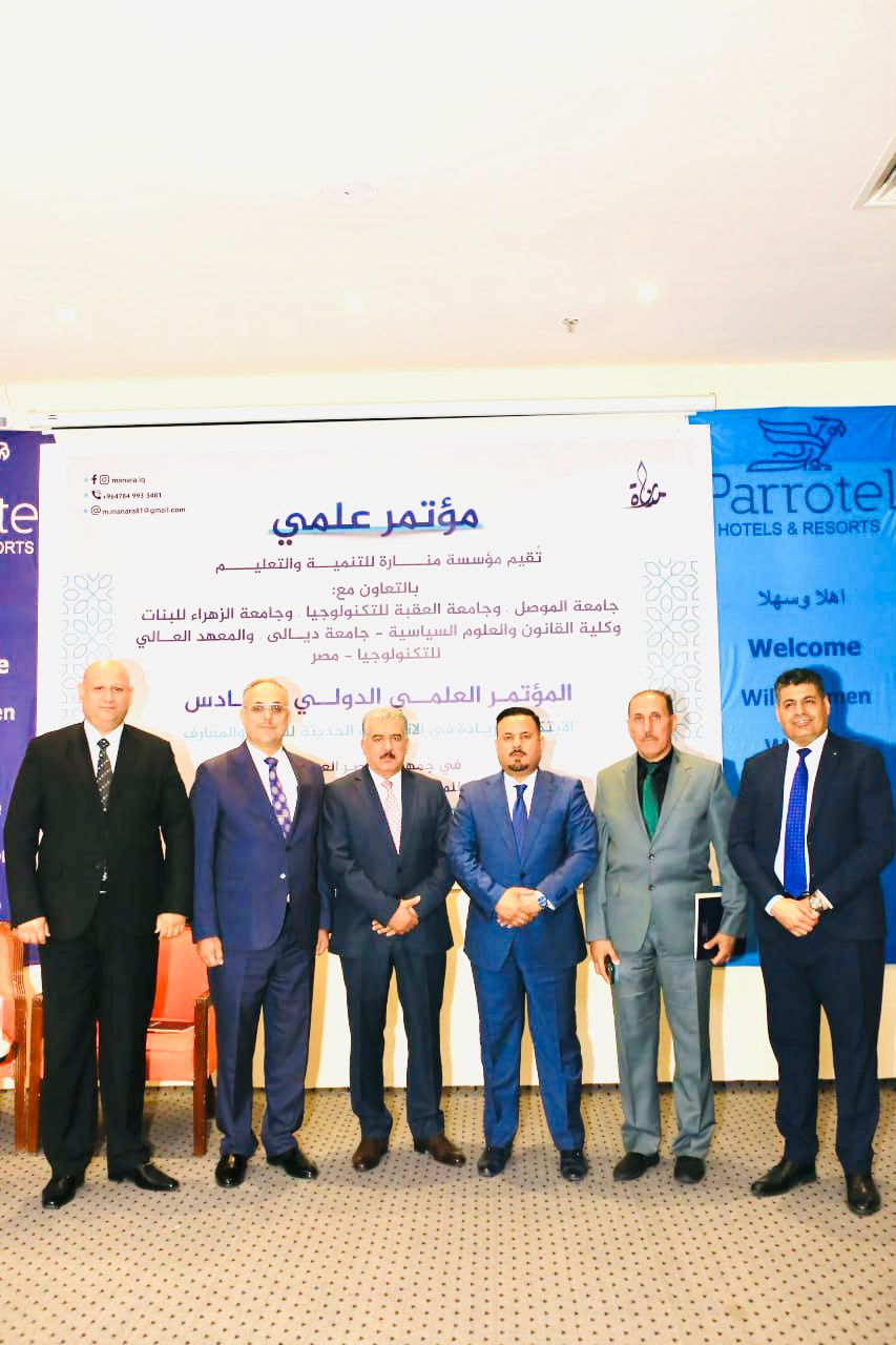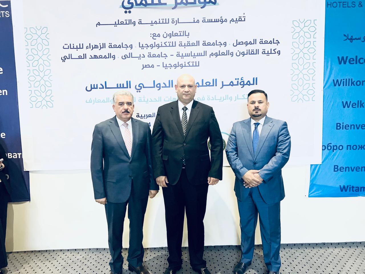 شارك كل من الاستاذ الدكتور ناظر احمد منديل والاستاذ المساعد الدكتور ممتاز مطلب اخبصي والاستاد المساعد الدكتور طاهر خلف سالم من التدريسيين على ملاك كليتنا في المؤتمر العلمي السادس "الابتكار والريادة في الاتجاهات الحديثة للعلوم والمعارف" الذي اقامته مؤسسة منار للتنمية والتعليم في جمهورية مصر العربية للفترة 27-28/4/2024 وبالتعاون مع جامعة الموصل وجامعة العقبة للتكنولوجية وجامعة الزهراء للبنات وكلية القانون والعلوم السياسية – جامعة ديالى والمعهد العالي للتكنولوجيا – مصر، سائلين المولى عز وجل ان يوفق الجميع بما فيه خيراً للعراق وسموه.