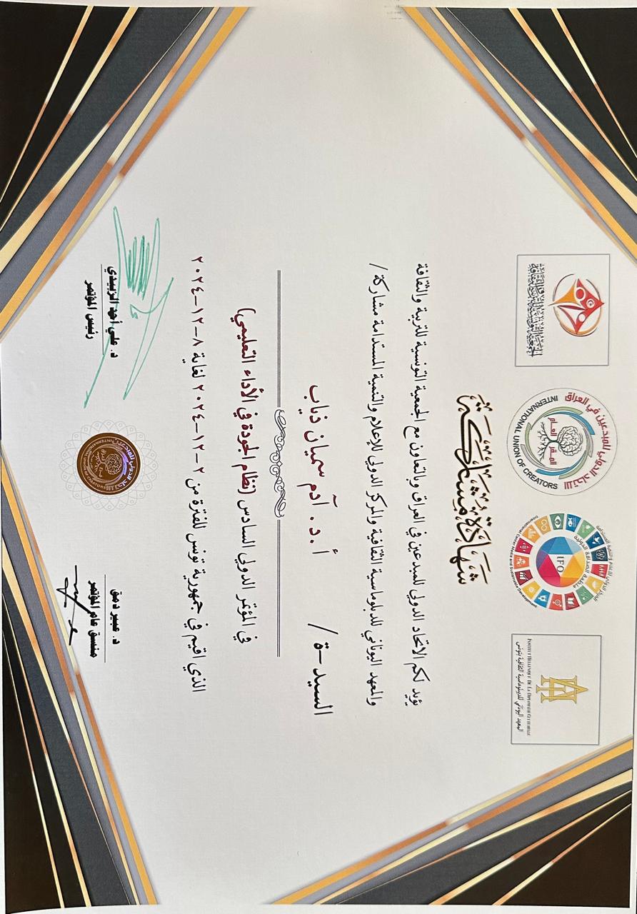 شارك كل من الاستاذ الدكتور أدم سميان ذياب والاستاذ الدكتور ياسر عواد شعبان والاستاذ المساعد علي سفيان عبدالله من التدريسيين على ملاك كليتنا في المؤتمر الدولي السادس "نظام الجودة في الاداء التعليمي" الذي اقامته مؤسسة منار للتنمية والتعليم في جمهورية تونس العربية للفترة 2-8/ 12/ 2024 وبالتعاون مع الجمعية التونسية للتربية والثقافة والمعهد اليوناني للدبلوماسية الثقافية والمركز الدولي للاعلام والتنمية المستدامة ، سائلين المولى عز وجل ان يوفق الجميع بما فيه خيراً للعراق وسموه.