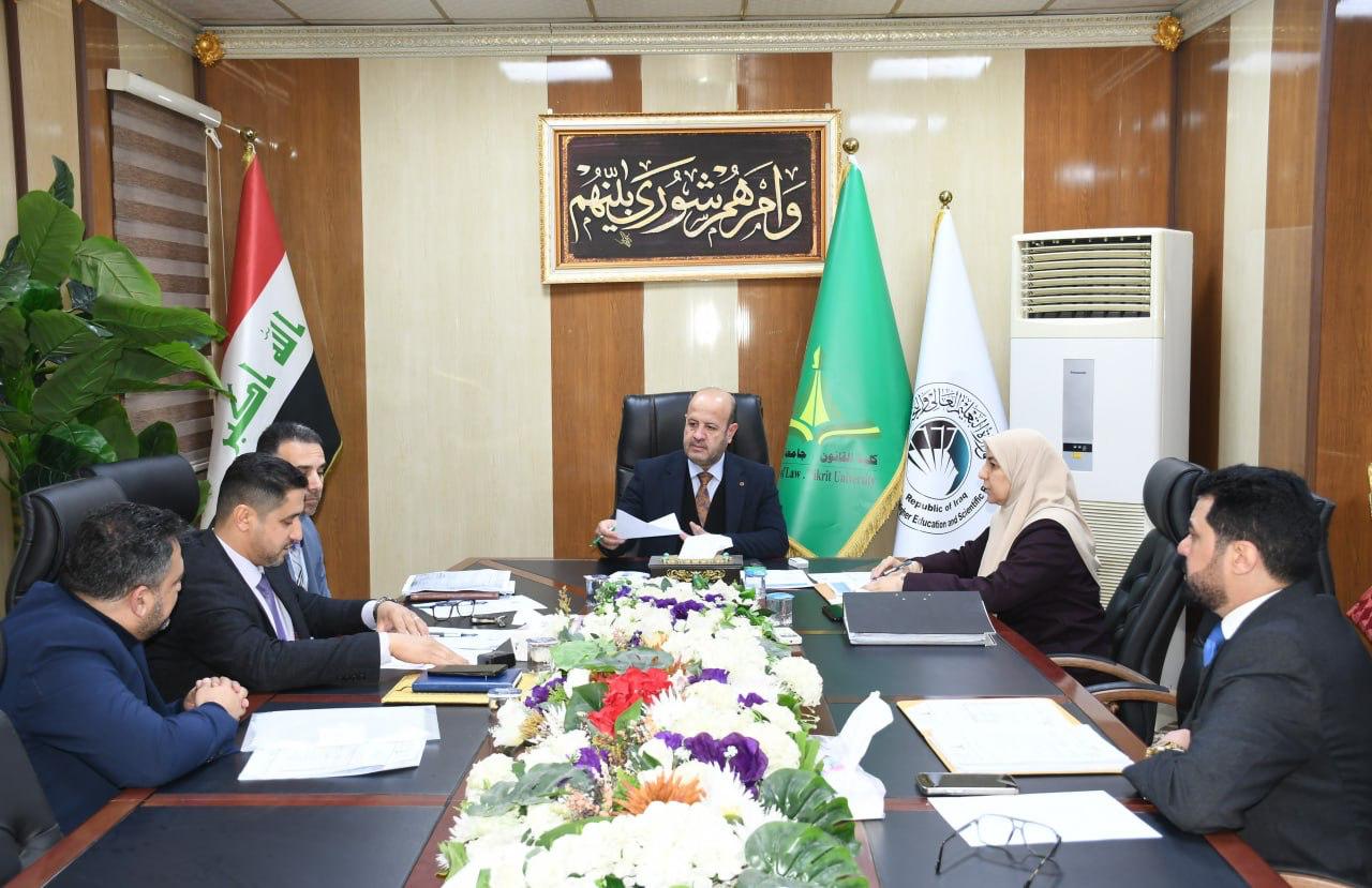 ترأس الاستاذ الدكتور وعد محمود رؤوف رئيس جامعة تكريت عميد كلية القانون من موقع ادنى مجلس كلية القانون (الجلسة السادسة) اليوم الاربعاء الموافق 29/1/2025 ناقش فيها عددا من القضايا والفقرات المدرجة في جدول اعماله ذات الصلة بالعملية التعليمية والإدارية، واتخذ فيها مجموعة من القرارات حسب الضوابط والتعليمات والصلاحيات الممنوحة للمجلس ،وناقش الاجتماع مجموعة من البنود الهامة، كان من أبرزها، امتحانات نصف السنة واللجان الامتحانية وتذليل العواقب التي تواجههم ، والاهتمام بخطة البحث العلمية ومتابعتها من قبل السادة رؤوساء الاقسام .