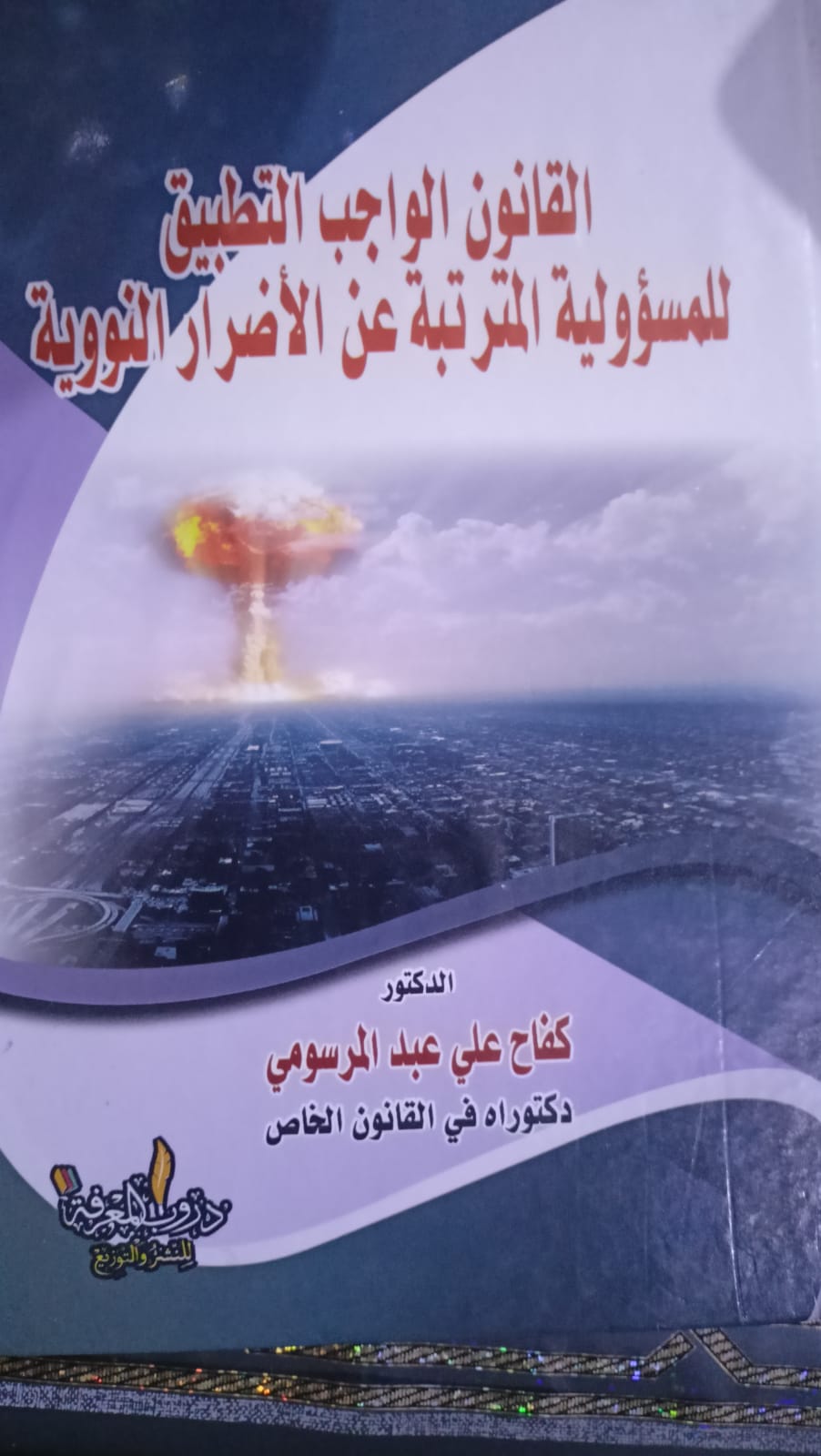أصدر التدريسي في كلية القانون - جامعة تكريت، الدكتور ( كفاح علي عبد المرسومي) كتاباً جديداً بعنوان ”(القانون الواجب التطبيق للمسؤلية المترتبة عن الأضرار النووية) تناول فيه(الاهمية في المسؤولية في استخدام الطاقة النووية وخطورة هذه الطاقة , وما يصاحبها من مستجدات تحتاج الى متابعة ,مع وضع تصور قانوني لمسالة التعويض عن تلك الاضرار , والجهة التي نلتزم بالتعويض , كما تبرز الاهمية النظرية في نزايد الانتهاكات التي تتضرر بها البيئة من جراء النشاطات النووية , اضافة لذلك اهمية الطاقة النووية اليوم كأحد مصادر الطاقة المتجددة والتي تعد طاقة نظيفة , كما تكمن اهمية الموضوع على ضرورة تكثيف الجهود الدولية لضمان الامن النووي كما تتجلى الاهمية في البحث عن القواعد وسبل تجنب الاخطار النووية.) ويهدف هذا الإصدار إلى إثراء المكتبة القانونية العراقية والعربية، وتزويد الطلبة والباحثين بمصدر علمي يسهم في تطوير الدراسات القانونية. سألين الباري عز وجل ان يوفق الجميع لما فيه خدمة بلدنا الحبيب.