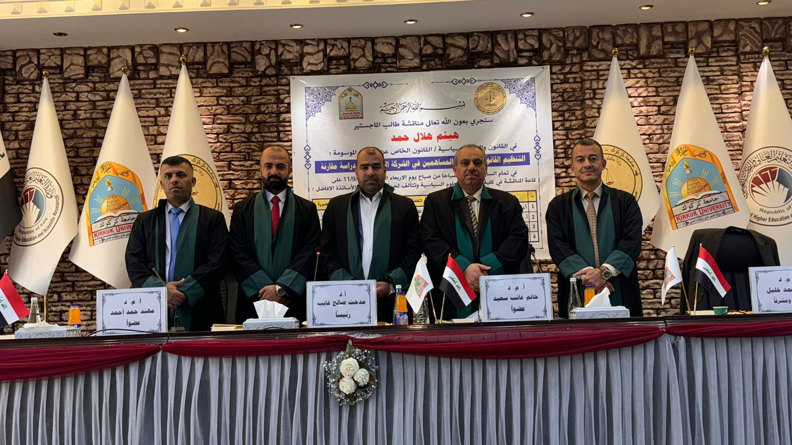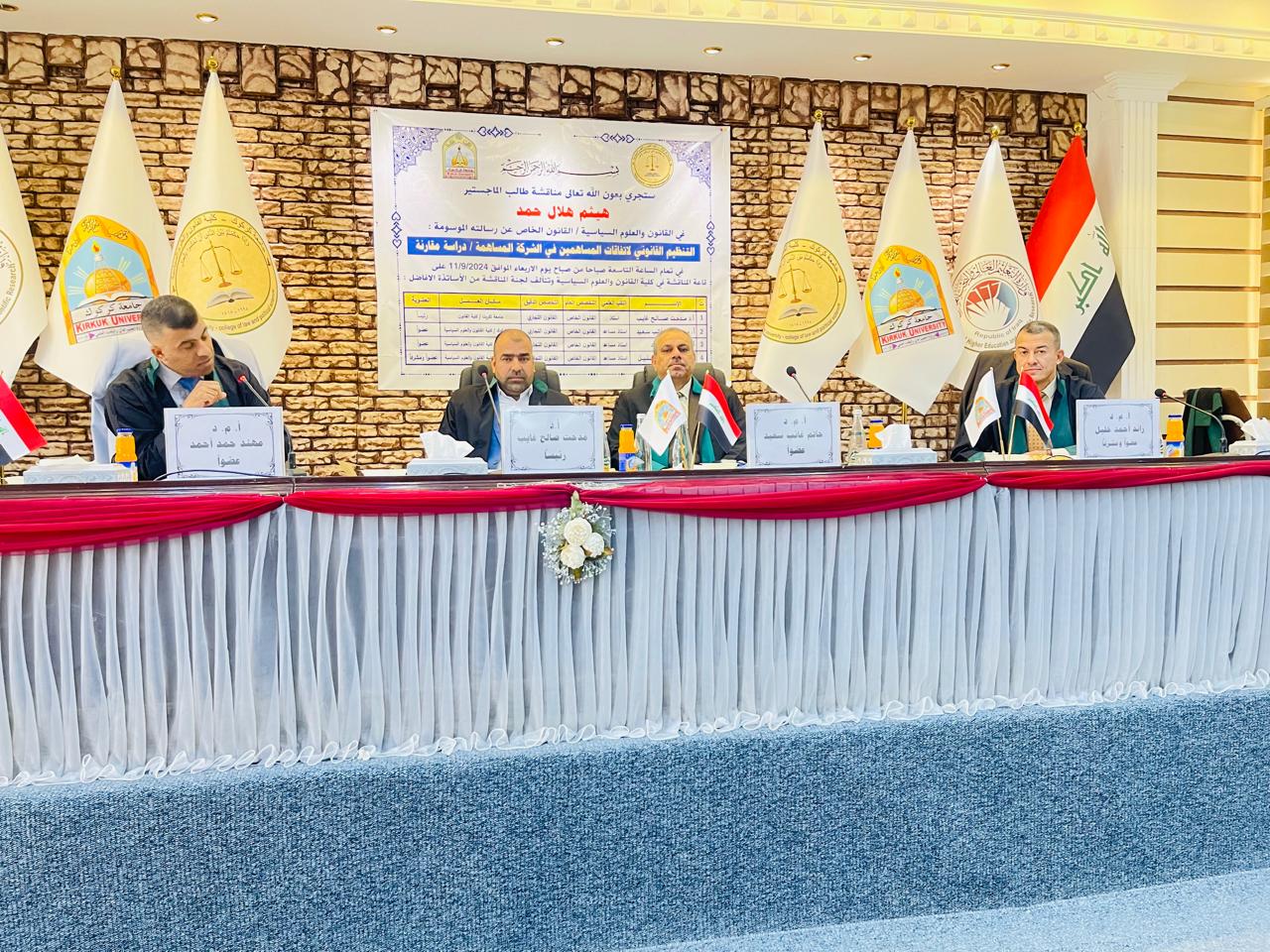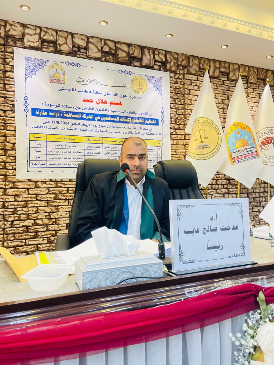 ترأس الاستاذ الدكتور مدحت صالح غايب التدريسي على ملاك كليتنا لجنة مناقشة رسالة ماجستير في كلية القانون والعلوم السياسية بجامعة كركوك والموسومة"التنظيم القانوني لاتفاقات المساهمين في الشركة المساهمة - دراسة مقارنة" للطالب (هيثم هلال حمد خلف) صباح يوم الاربعاء الموافق 11-9-2024 .