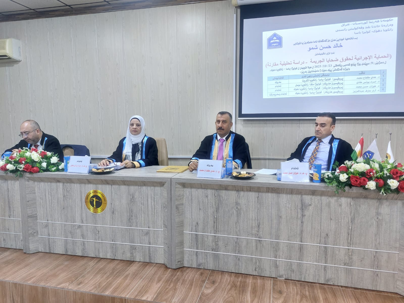 ترأس الأستاذ الدكتور عدي طلفاح محمد هذا اليوم المصادف 23/ 10/ 2025 مناقشة رسالة الماجستير الموسومة (الحماية الإجرائية لحقوق ضحايا الجريمة) للطالب (خالد حسن شمو) وذلك في كلية القانون بجامعة دهوك.