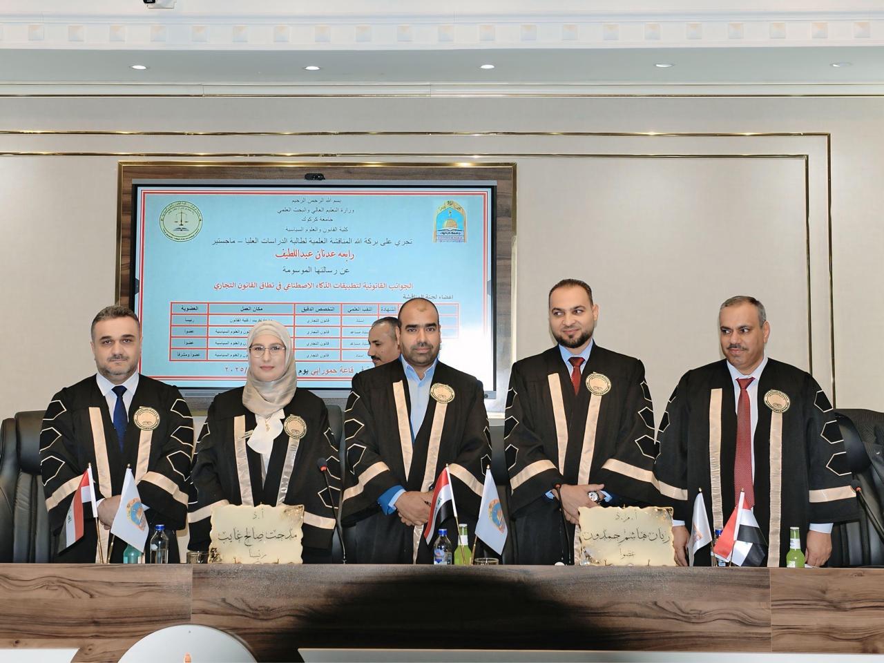 ترأس الأستاذ الدكتور مدحت صالح غايب يوم الخميس المصادف 30/ 10/ 2025 مناقشة رسالة الماجستير الموسومة (الجوانب القانونية لتطبيقات الذكاء الاصطناعي في نطاق القانون التجاري) للطالبة (رابعة عدنان عبداللطيف)وذلك في كلية القانون والعلوم السياسية بجامعة كركوك.