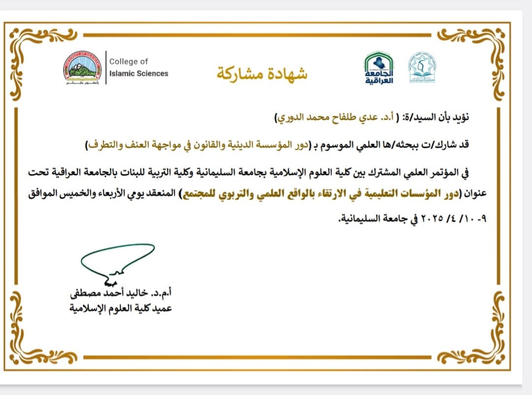 شارك الاستاذ الدكتور عدي طلفاح محمد في المؤتمر العلمي المشترك بين كلية العلوم الاسلامية بجامعة السليمانية وكلية التربية للبنات بالجامعة العراقية في جامعة السليمانية تحت عنوان "دور المؤسسات التعليمية في الارتقاء بالواقع العلمي والتربوي للمجتمع"وكان عنوان البحث "دور المؤسسة الدينية والقانون في مواجهة العنف والتطرف" الذي اقامته جامعة السليمانية يومي الأربعاءوالخميس في 9- ١٠/ 4/ 2025، سائلين المولى عز وجل ان يوفق الجميع بما فيه خيراً للعراق وسموه.