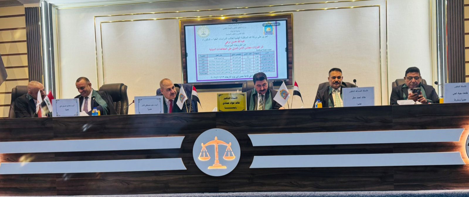 شارك الاستاذ المساعد الدكتور خالد احمد مطر التدريسي على ملاك كليتنا لجنة مناقشة اطروحة الدكتوراه في كلية الحقوق بجامعة الموصل والموسومة ب "أثر قرارات مجلس الامن الدولي على المعاهدات الدولية - دراسة مقارنة" للطالب(عبدالله حسن مرعي) صباح يوم الاربعاء الموافق 13-11-2024 .