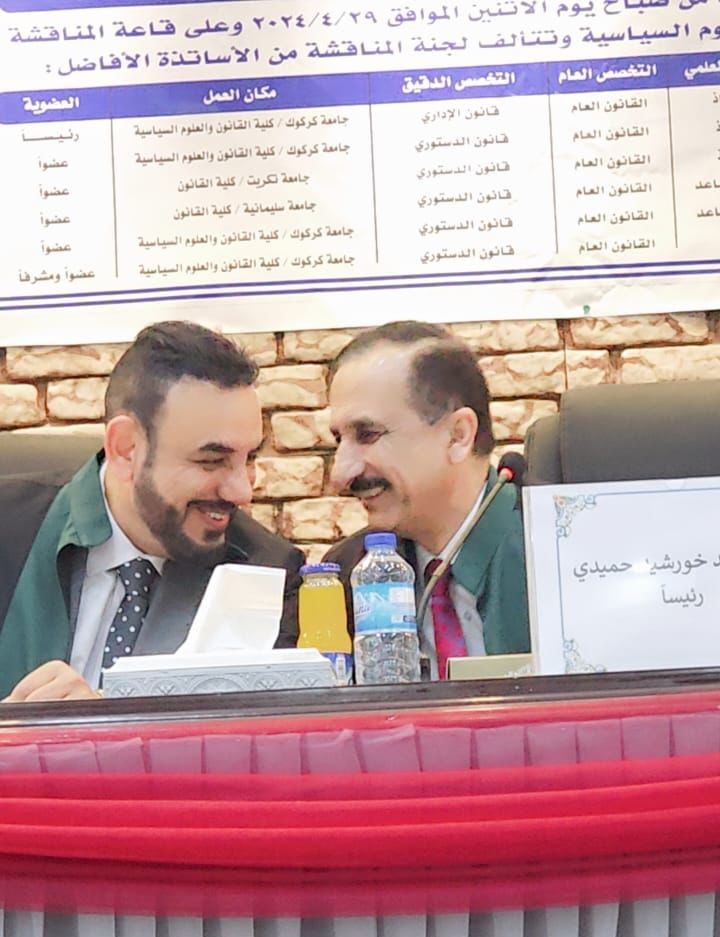 شارك الاستاذ الدكتور محمد يوسف محيميد التدريسي في كلية القانون بجامعة تكريت في مناقشة أطروحة الدكتوراه في كلية القانون والعلوم السياسية بجامعة كركوك والموسومة"دور القضاء الدستوري في حماية حقوق الناخبين(دراسة مقارنة)" للطالب عماد علي رشيد .