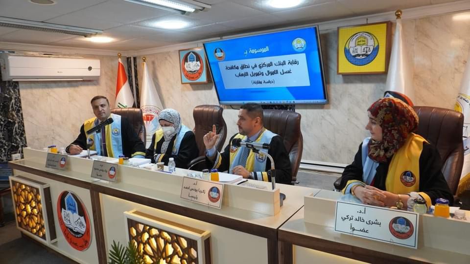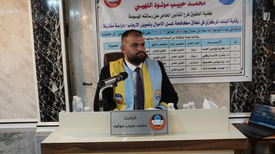 ترأس الاستاذ الدكتور زكريا يونس أحمد معاون العميد لشؤون الطلبة في كلية القانون بجامعة تكريت لجنة مناقشة رسالة ماجستير في كلية القانون والعلوم السياسية بجامعة الموصل والموسومة"رقابة البنك المركزي في نطاق مكافحة غسل الاموال وتمويل الارهاب -دراسة مقارنة" للطالب (محمد حبيب مولود) صباح يوم الأحد الموافق 12-5-2024 .