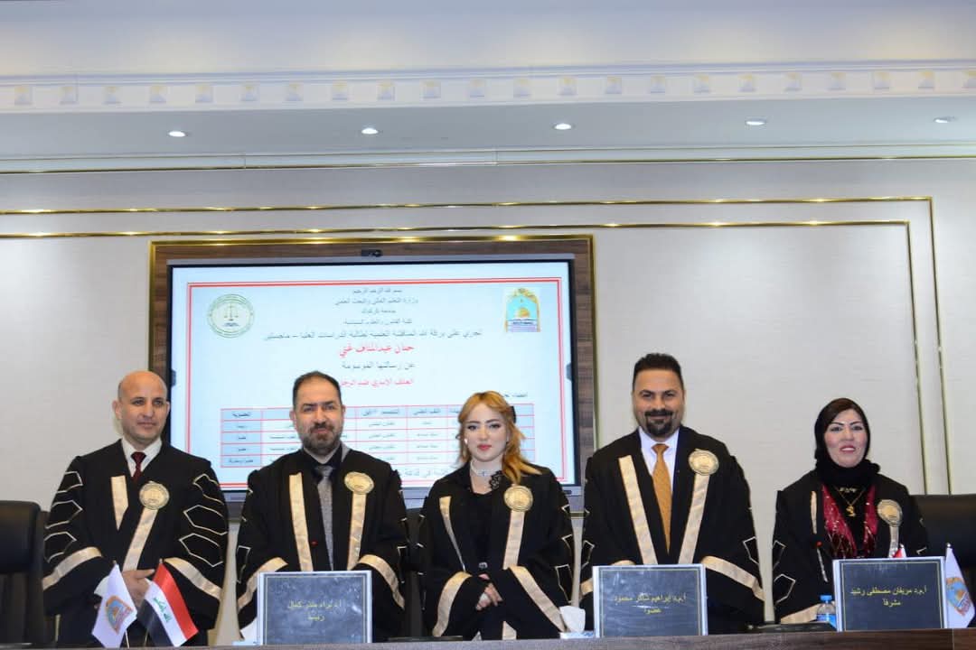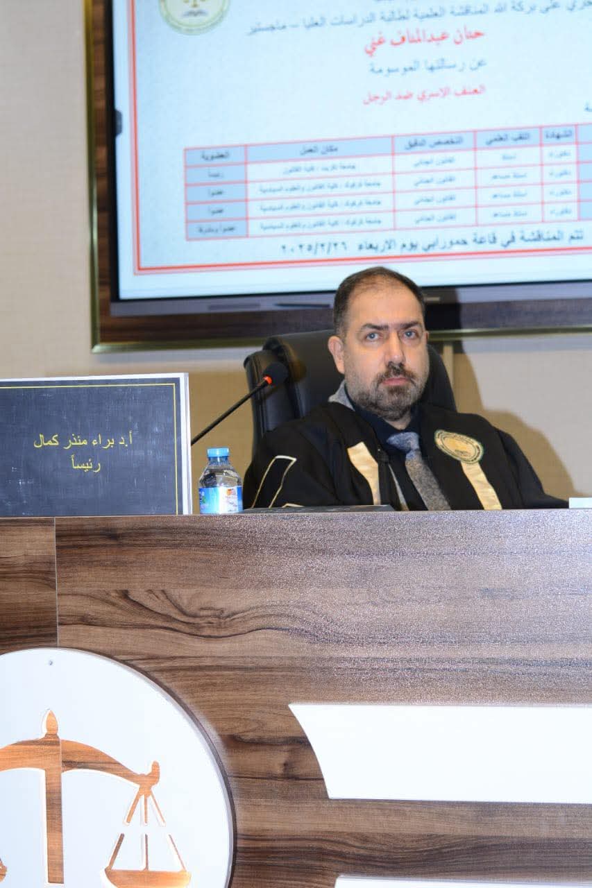 ترأس الاستاذ الدكتور براء منذر كمال عبداللطيف التدريسي على ملاك كليتنا لجنة مناقشة رسالة ماجستير في جامعة كركوك - كلية القانون والعلوم السياسية والموسومة ب (العنف الأسري ضد الرجل) للباحثة((حنان عبد المناف غني)).