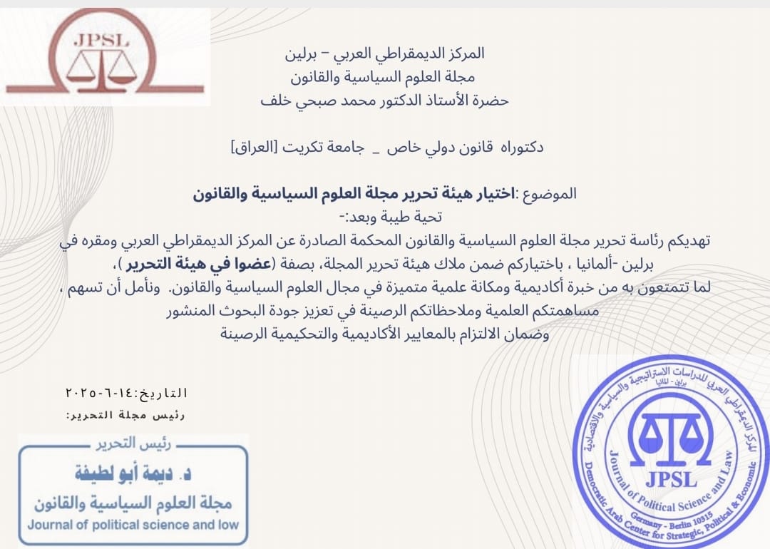 إختيار الاستاذ الدكتور محمد صبحي خلف الجواد عضو هيئة تحرير في مجلة عالمية مقرها برلين - ألمانيا... المجلة متخصصة في مجال الدراسات القانونية والسياسية. تم الاختيار لما يتمع به من خبرة أكاديمية وعلمية في مجال الدراسات القانونية الناطقة باللغات الانكليزية والبولندية الألمانية التي يتقنها.