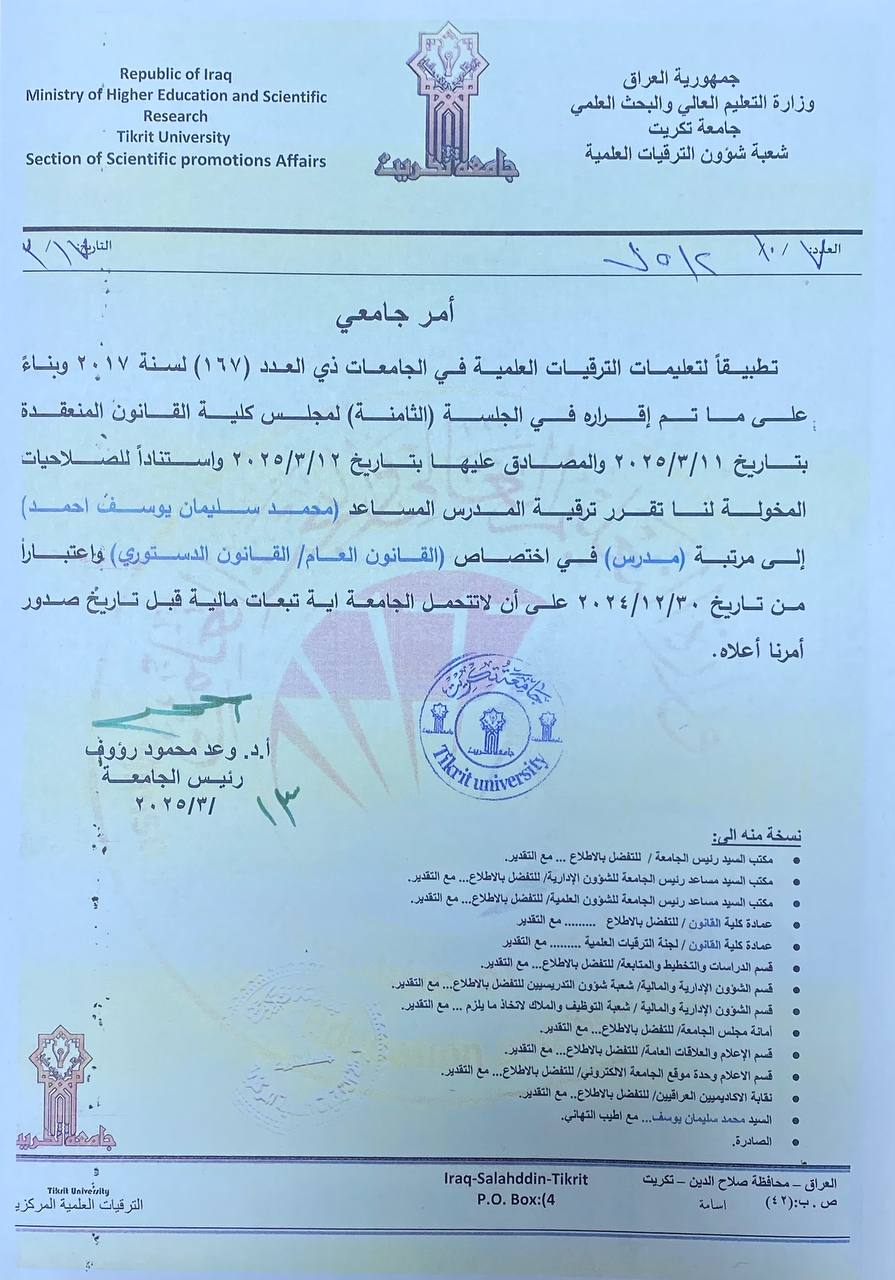 تتقدم عمادة كلية القانون المتمثلة بالسيد العميد (الاستاذ الدكتور نايف أحمد ضاحي) وكافة منتسبيها بأسمى آيات التهاني والتبريكات الى الاستاذ (محمد سليمان يوسف أحمد) بمناسبة ترقيته العلمية من (مدرس مساعد) الى(مدرس) متمنين له دوام الموفقية والنجاح .
