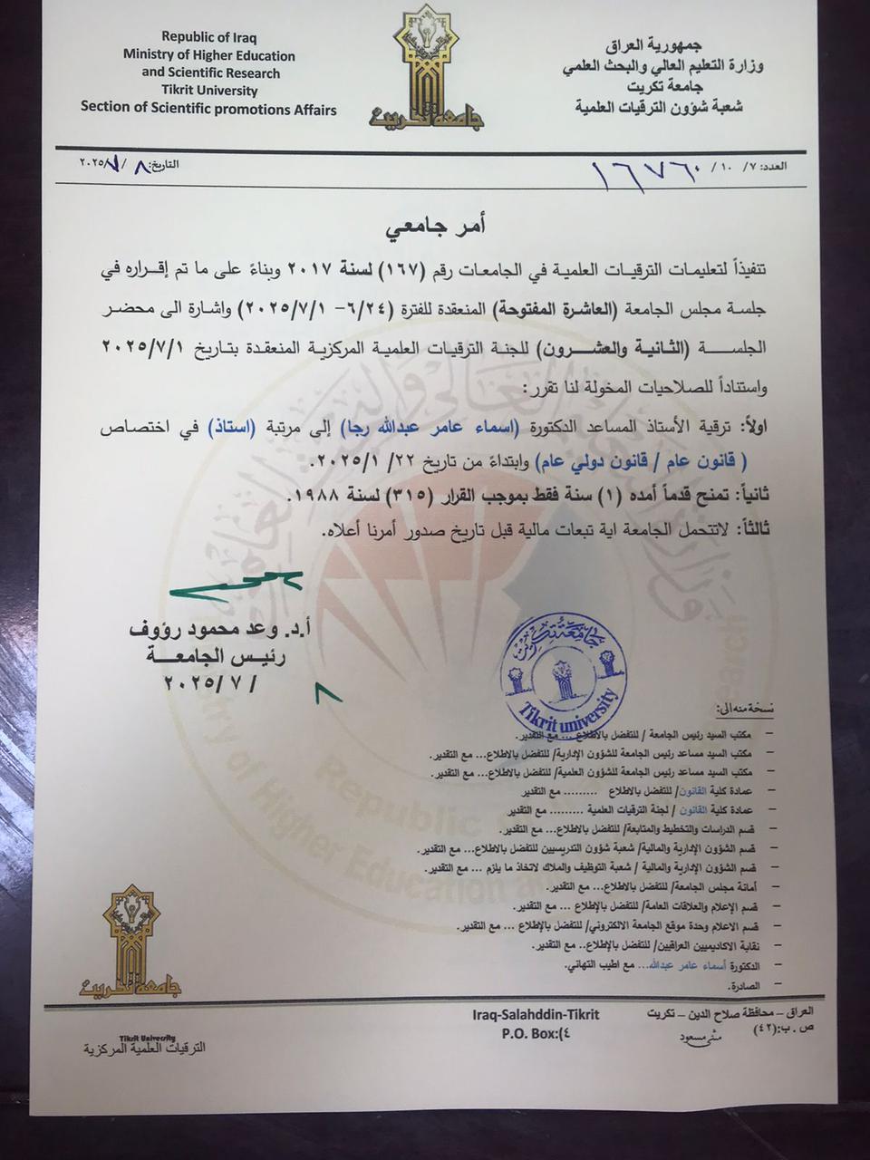 تتقدم عمادة كلية القانون المتمثلة بالسيد العميد (الاستاذ الدكتور نايف احمد ضاحي) وكافة منتسبيها بأسمى آيات التهاني والتبريكات الى الدكتورة (اسماء عامر عبدالله رجا) بمناسبة ترقيتها العلمية من (أستاذ مساعد) الى(أستاذ) متمنين لها دوام الموفقية والنجاح .
