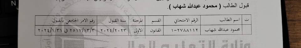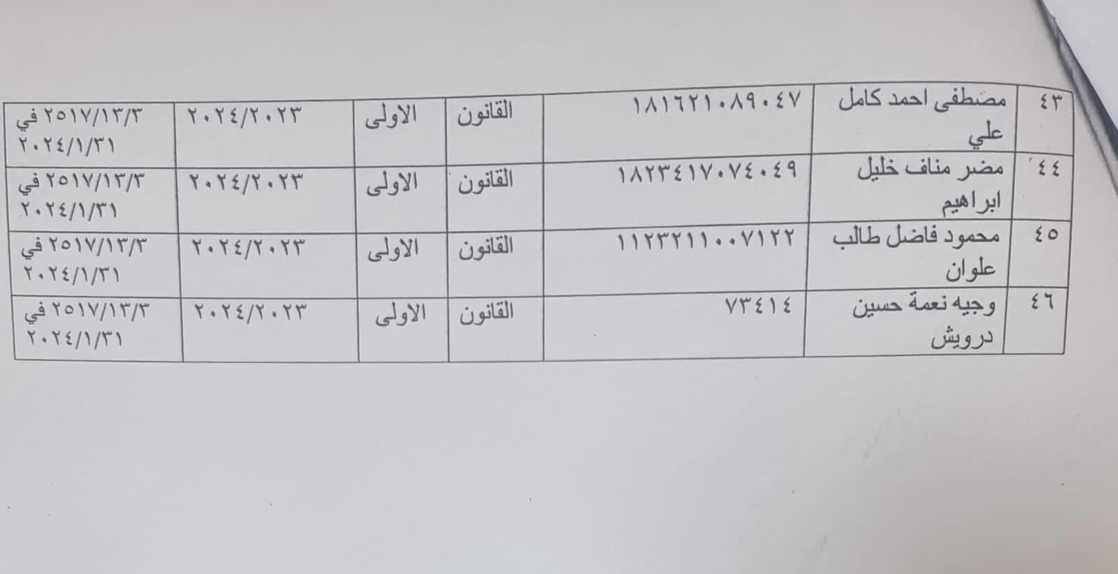 على الطلبة الواردة أسماؤهم في الجداول المرفقة جلب نسخة من الوثيقة الاصلية ومراجعة كلية القانون شعبة التسجيل لغرض تقديم طلب برفع الاسم من الأمر الجامعي الخاص بالغاء القبول وخلال مدة يومين من تاريخ نشر الإعلان