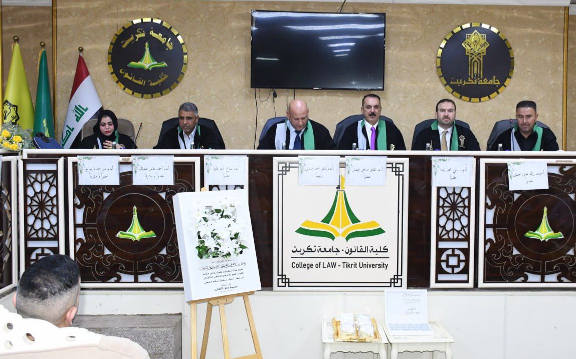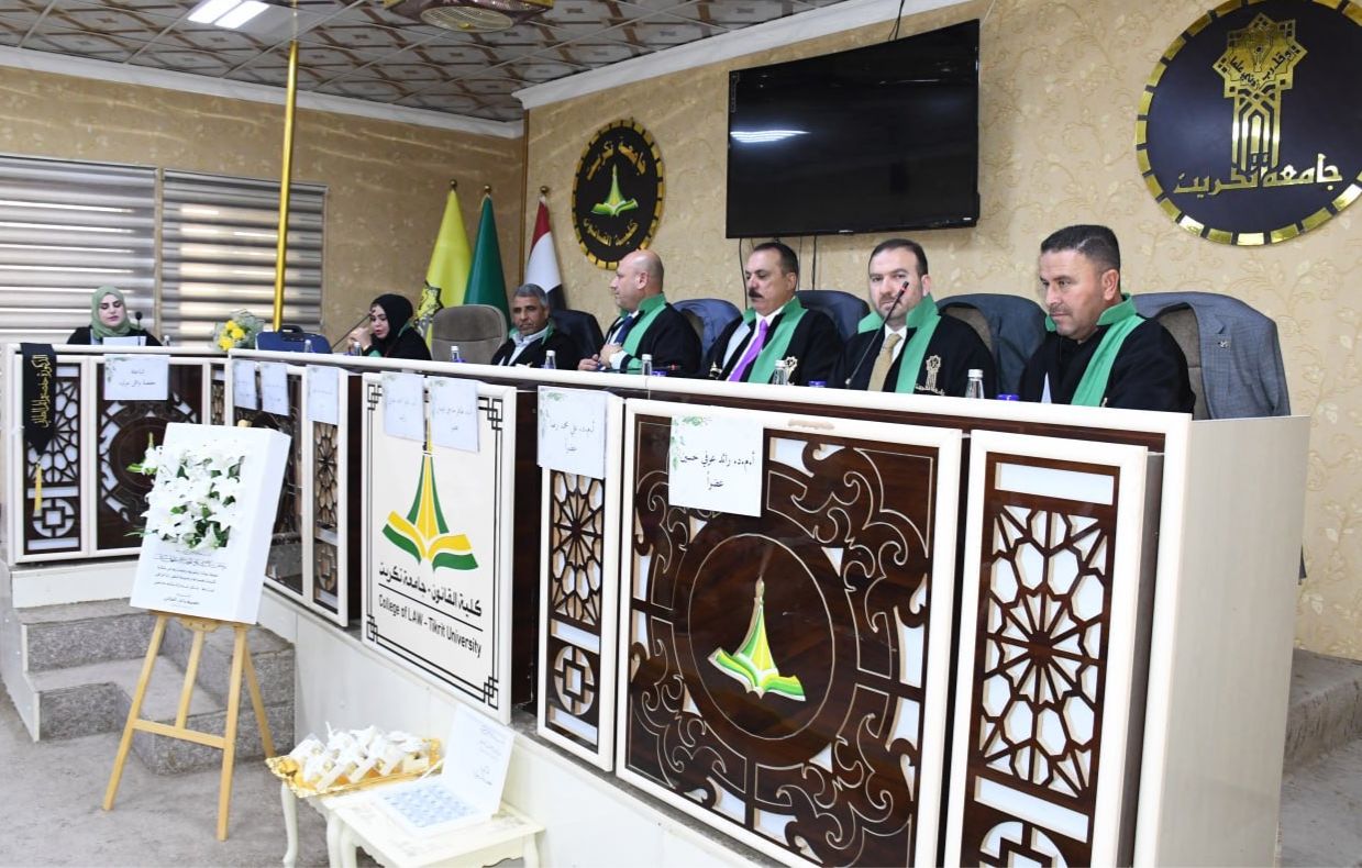 نوقشت في كلية القانون - جامعة تكريت اطروحة دكتوراه في القانون العام للطالبة (حفصه وائل مولود) والموسومة ب (القرارات الادارية بين السحب والالغاء دراسة تطبيقية في مديرية تربية صلاح الدين) على قاعة الشهيد الدكتور ضامن العبيدي في مبنى الكلية صباح يوم الاربعاء الموافق 15-10-2024.