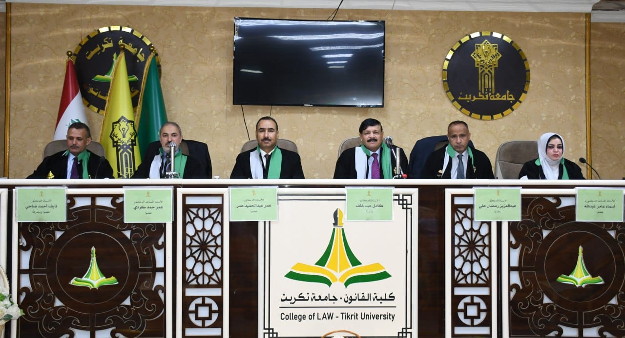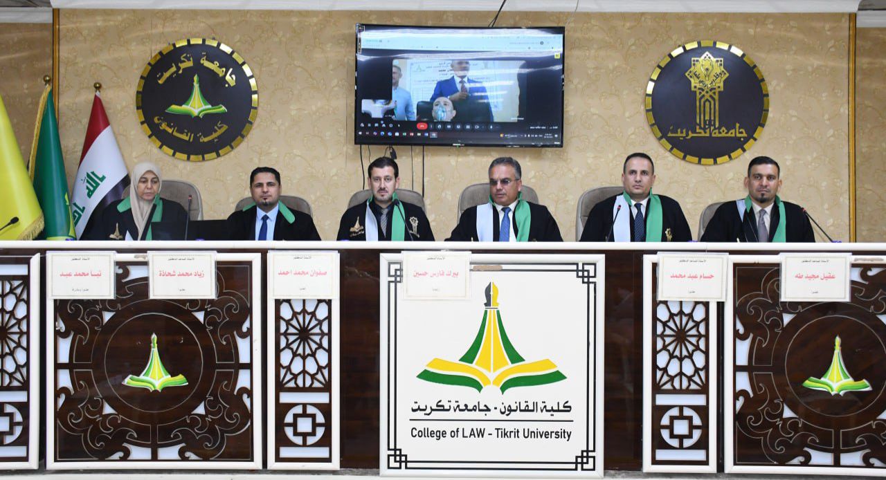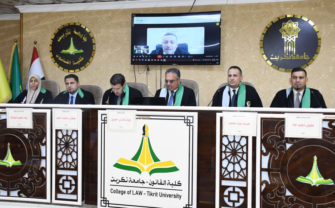 نوقشت في كلية القانون - جامعة تكريت اطروحة دكتوراه في القانون العام للطالبة (فراس طعان محمد) والموسومة ب (عدول القاضي عن نظر الدعوى لصالح القضاء الأجنبي - دراسة مقارنة) على قاعة الشهيد الدكتور ضامن العبيدي في مبنى الكلية صباح يوم الخميس الموافق 16-10-2024.