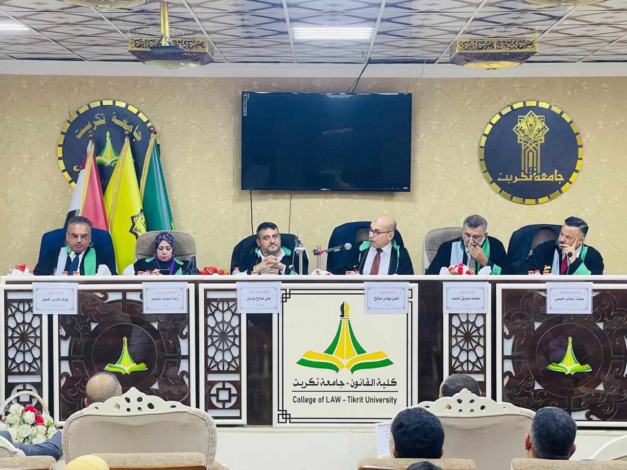 نوقشت في كلية القانون - جامعة تكريت أطروحة دكتوراه في القانون العام للطالبة (ندى ساجر ناصر) والموسومة ب(تعليق نقل ملكية العقار على تسديد الثمن في المجمعات السكنية الاستثمارية - دراسة مقارنة) على قاعة الشهيد الدكتور ضامن العبيدي في مبنى الكلية صباح يوم الخميس الموافق 3-10-2024.