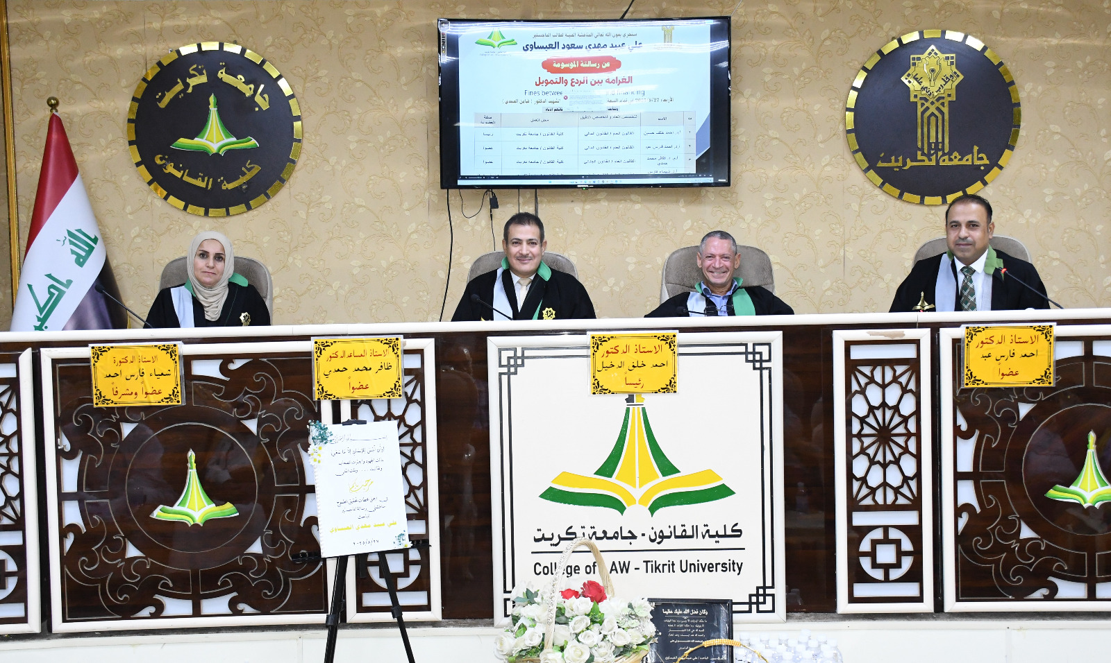 نوقشت في كلية القانون - جامعة تكريت رسالة ماجستير في القانون المالي للطالب (علي عبيد مهدي) والموسومة ب (الغرامة بين الردع والتمويل) وذلك على قاعة الشهيد الدكتور ضامن العبيدي في مبنى الكلية صباح يوم الاربعاء الموافق 27-8-2025.