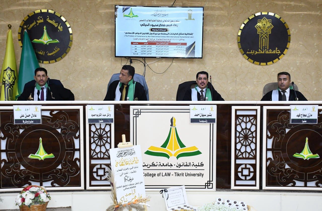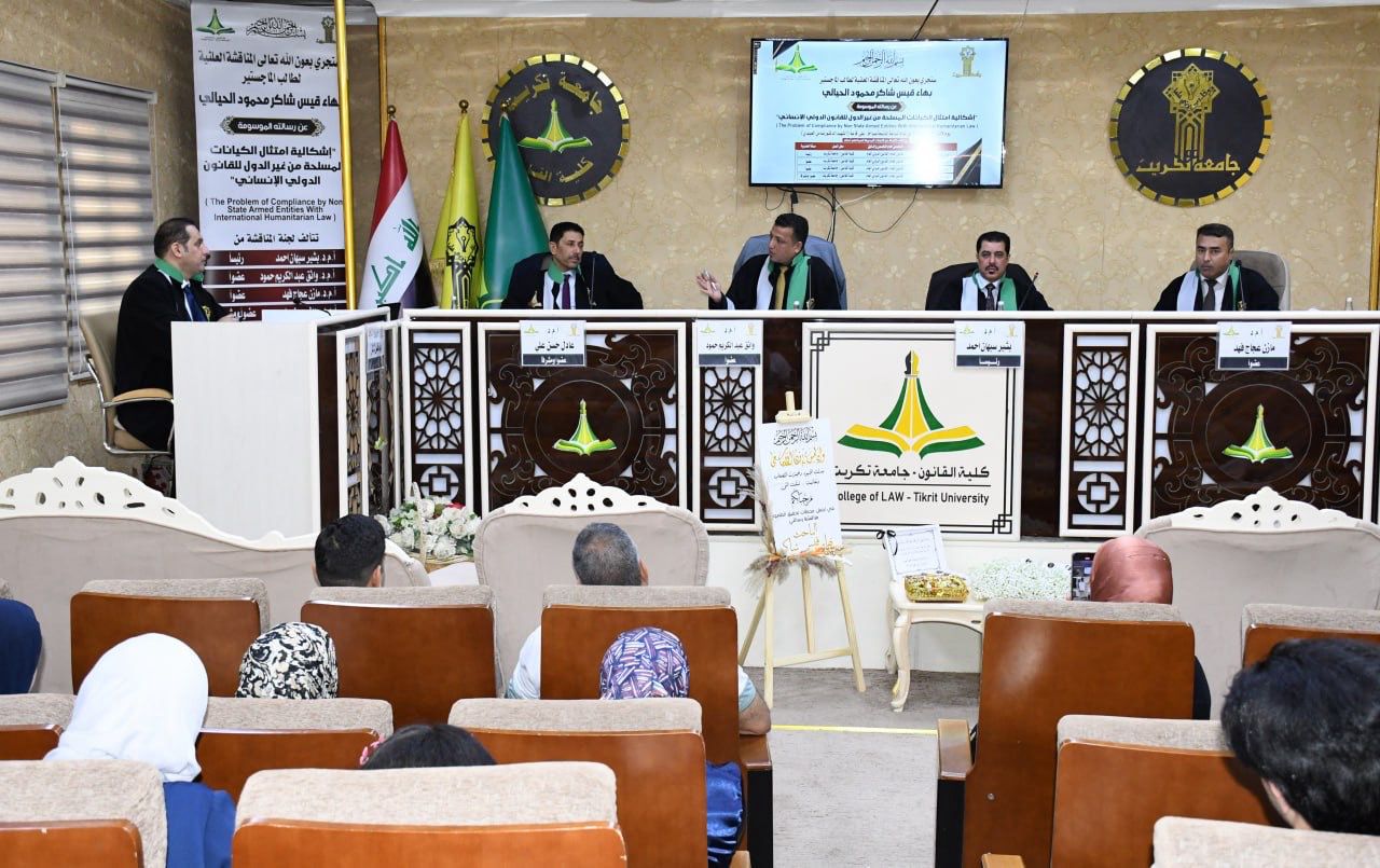 نوقشت في كلية القانون - جامعة تكريت رسالة ماجستير في القانون الخاص للطالب (بهاء قيس شاكر محمود ) والموسومة ب (اشكالية امتثال الكيانات المسلحة من غير الدول للقانون الدولي الانساني) وذلك على قاعة الدكتور ضامن العبيدي في مبنى الكلية صباح يوم الاثنين الموافق 7-7-2025