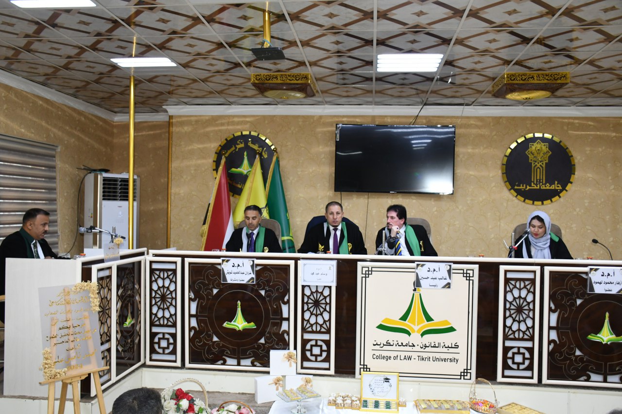 نوقشت في كلية القانون - جامعة تكريت رسالة ماجستير في القانون الخاص للطالب (محمد نامس علي) والموسومة ب (المسؤولية المدنية للشركة عن التصرف في شريحة الهاتف النقال - دراسة مقارنة) وعلى قاعة الشهيد الدكتور ضامن العبيدي في مبنى الكلية صباح يوم الخميس الموافق 12-9-2024.