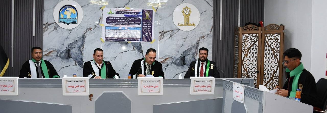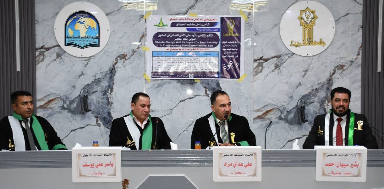 نوقشت في كلية القانون - جامعة تكريت رسالة ماجستير في القانون العام للطالب (شامل زامل كايم) والموسومة ب (التغير المناخي واثره على الامن الغذائي في القانون الدولي العام المعاصر) وذلك على قاعة السلام في كلية العلوم السياسية صباح يوم الاربعاء الموافق 5-6-2024