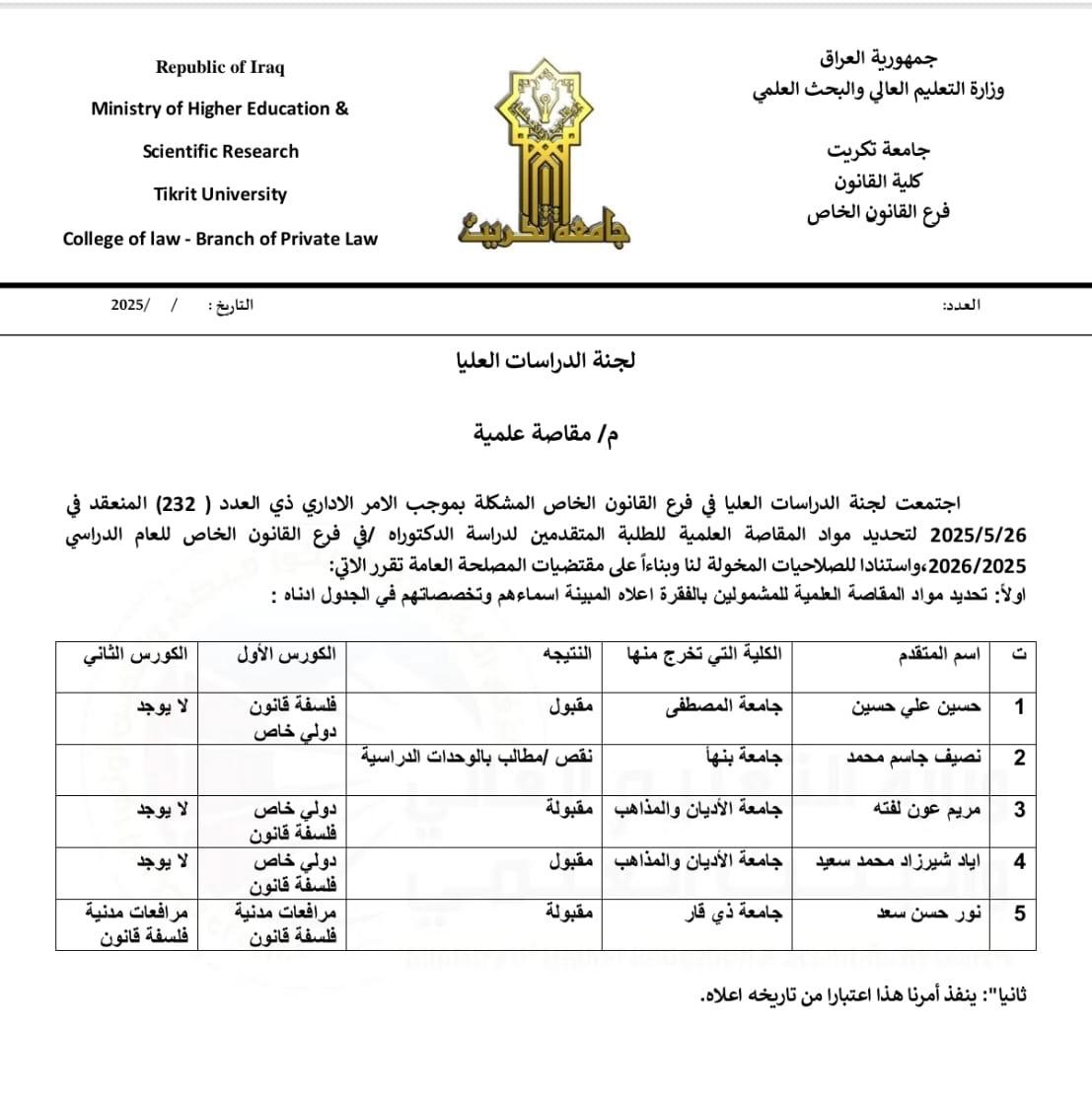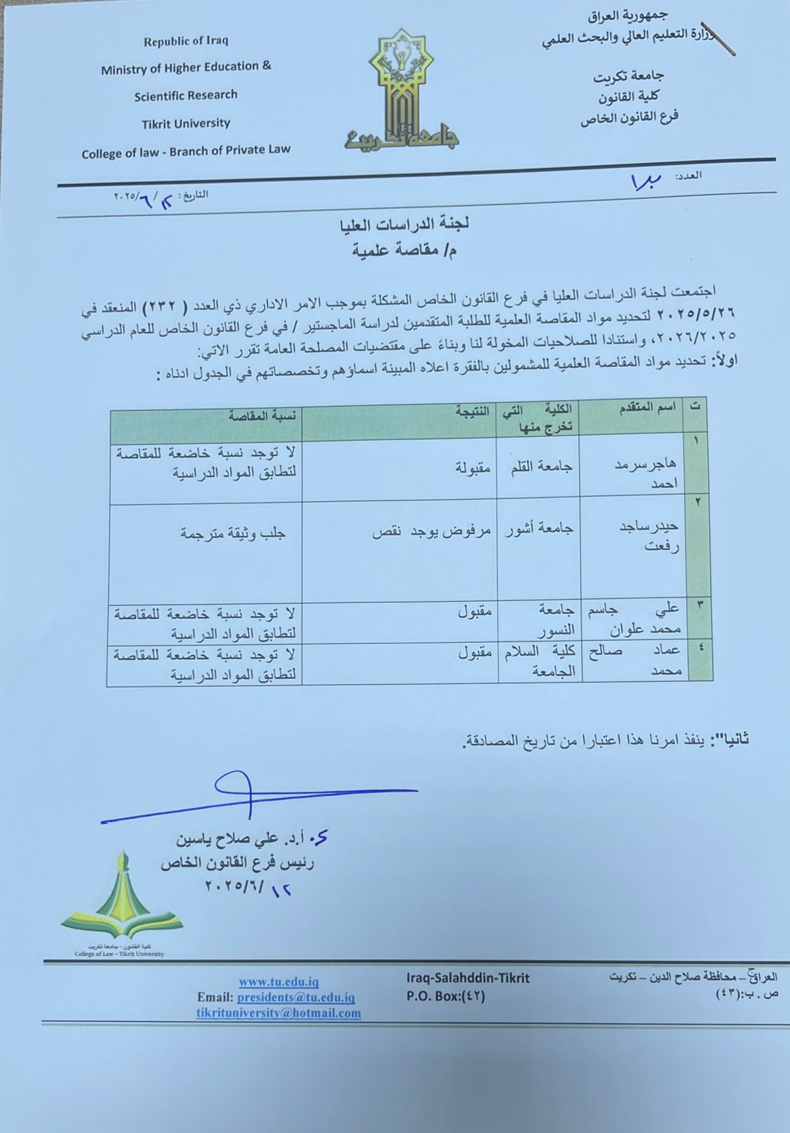 للمتقدمين للدراسات العليا الوجبة الثانية المذكورة اسماؤهم في الجداول ادناه والذين تم اخضاعهم للمقاصة العليمة / من قبل لجنة الدراسات العليا / الفرع الخاص ، نود اعلامكم بأن المشمولين بالمقاصة والمستبعدين منها ، اذ نحيطكم علماً لأكمال إجراءات التقديم.