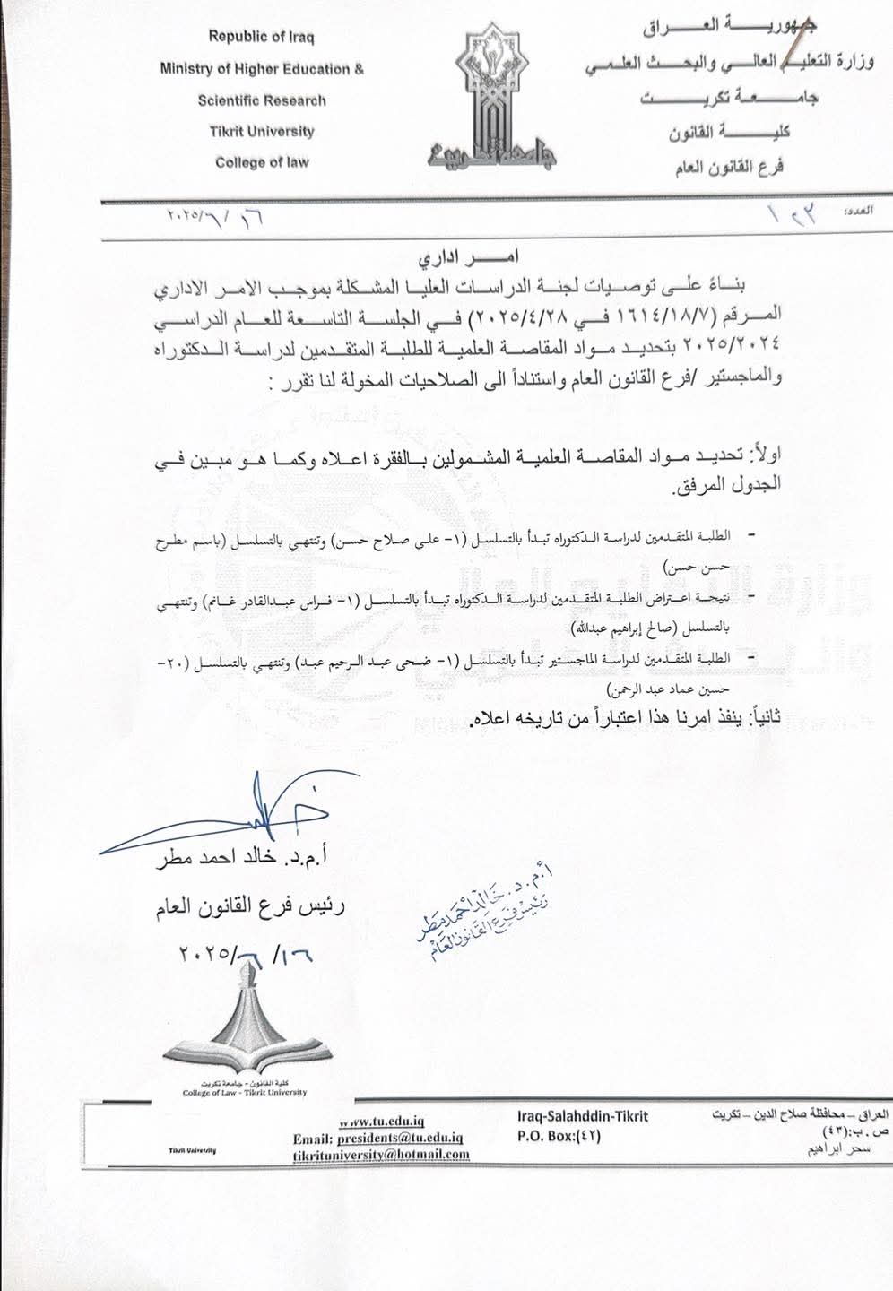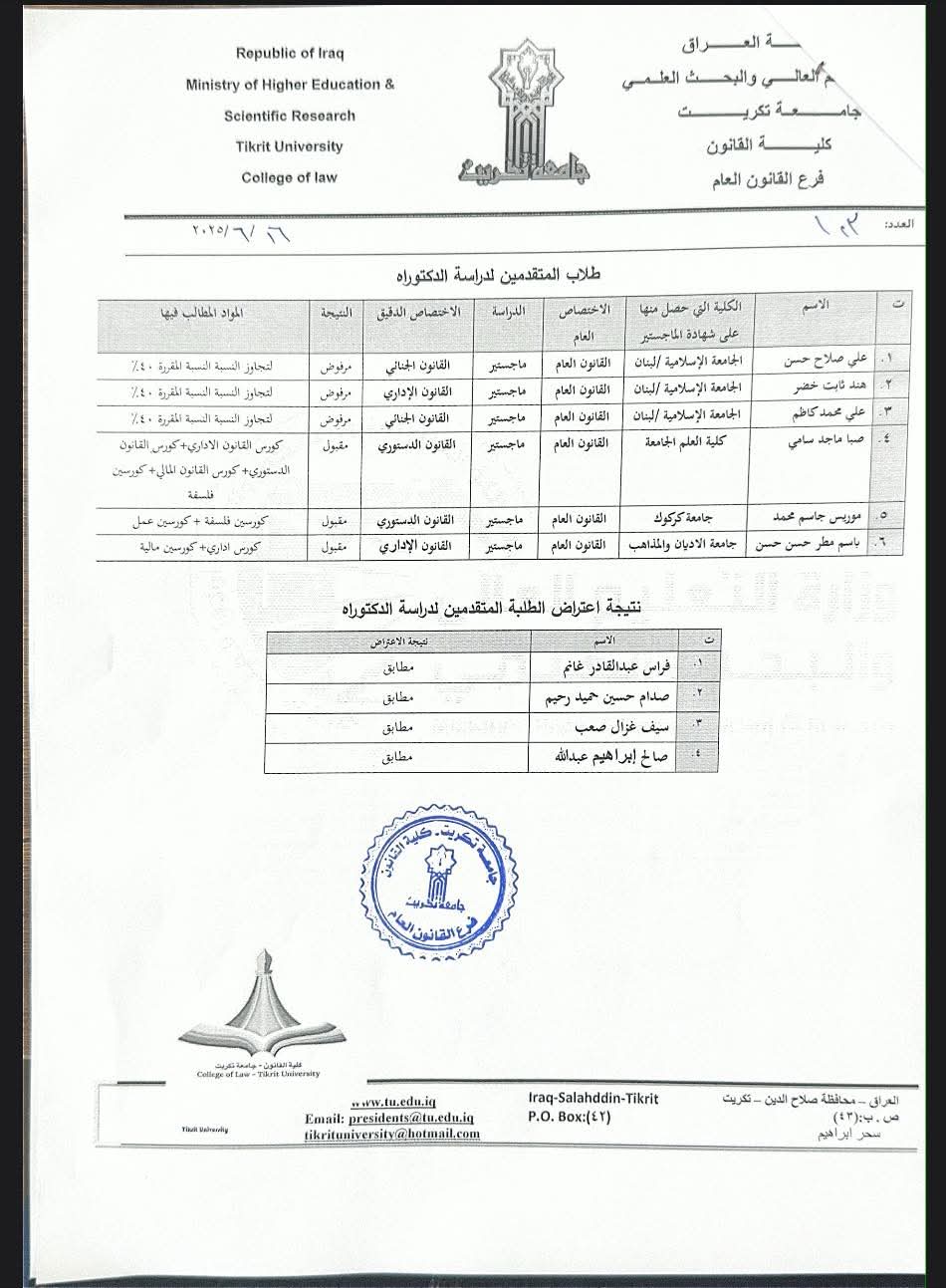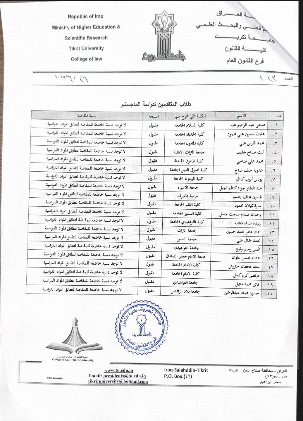 المتقدمين للدراسات العليا الوجبة الثالثه المذكورة اسماؤهم في الجداول ادناه والذين تم اخضاعهم للمقاصة العلمية / من قبل لجنة الدراسات العليا / الفرع العام ، نود اعلامكم بأن المشمولين بالمقاصة والمستبعدين منها ، اذ نحيطكم .علماً لأكمال إجراءات التقديم.