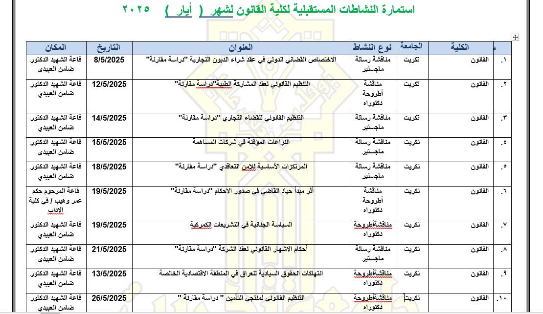 استمارة النشاطات المستقبلية لكلية القانون لشهر (أيار) 2025.