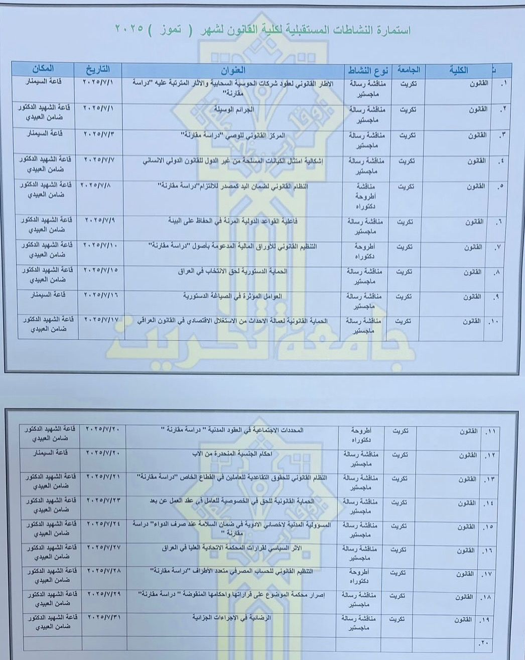 أستمارة النشاطات المستقبلية لكلية القانون لشهر تموز 2025 .