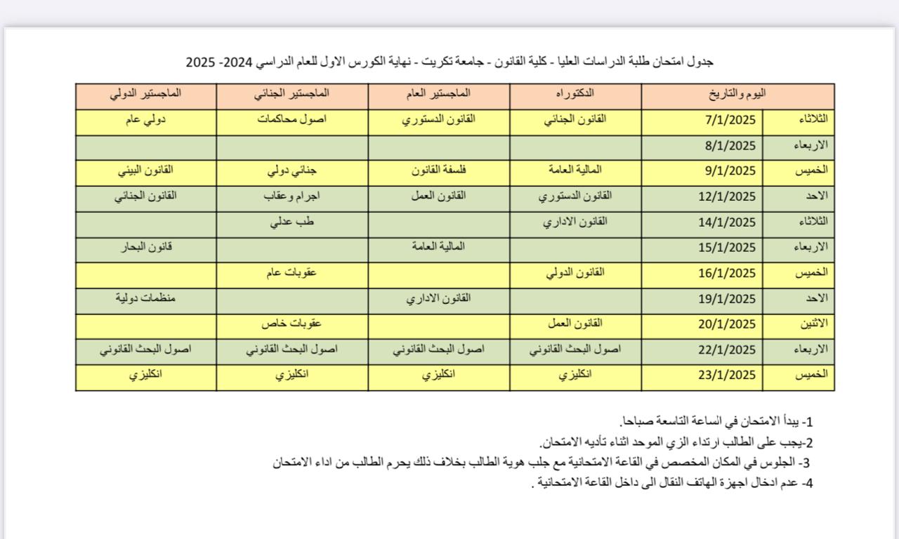 جدول امتحان طلبة الدراسات العليا - كلية القانون - جامعة تكريت للعام الدراسي 2024 - 2025..