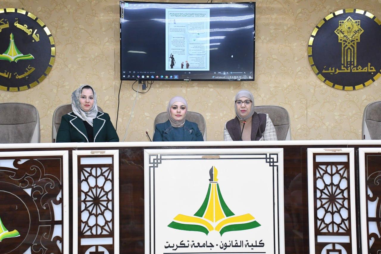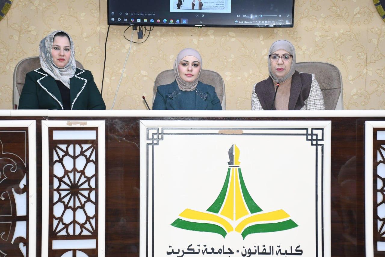 برعاية السيد رئيس جامعة تكريت الاستاذ الدكتور وعد محمود رؤوف ، وبأشراف السيد عميد كلية القانون الاستاذ الدكتور نايف احمد ضاحي ، نظّمت كلية القانون وبالتعاون مع مركز التعليم المستمر في جامعة تكريت دورة علمية بعنوان ( مدى نجاعة الحماية القانونية للمرأة من العنف المعنوي في إطار القوانين الخاصة ) وذلك يوم الثلاثاء الموافق 9-12-2025 على قاعة الشهيد الدكتور ضامن العبيدي والتي قدّمتها كل من :