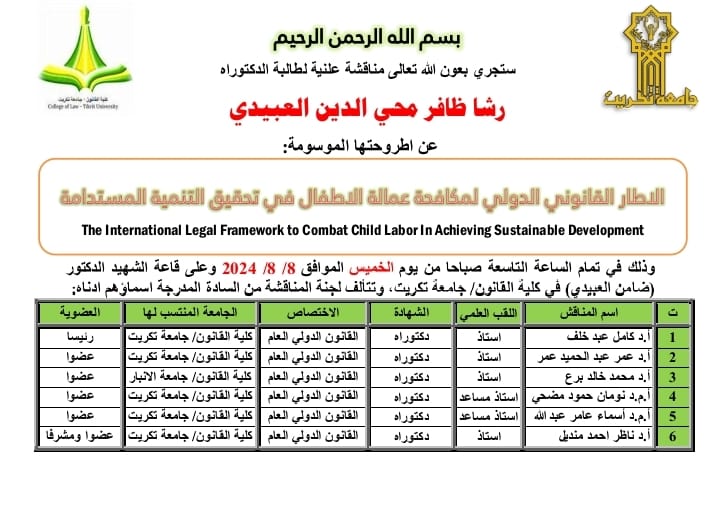 🔴ستجرى بعون الله مناقشة اطروحة الدكتوراه للطالبة "رشا ظافر محي الدين العبيدي" عن اطروحتها الموسومة" الاطار القانوني الدولي لمكافحة عمالة الاطفال في تحقيق التنمية المستدامة" صباح يوم الخميس الموافق 8-8-2024 وعلى قاعة الشهيد الدكتور ضامن العبيدي.. شعبة ال