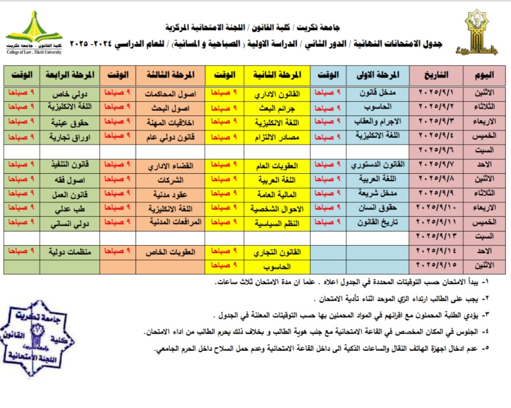 جدول امتحان طلبة الدراسات العليا - كلية القانون - جامعة تكريت للعام الدراسي 2024 - 2025..