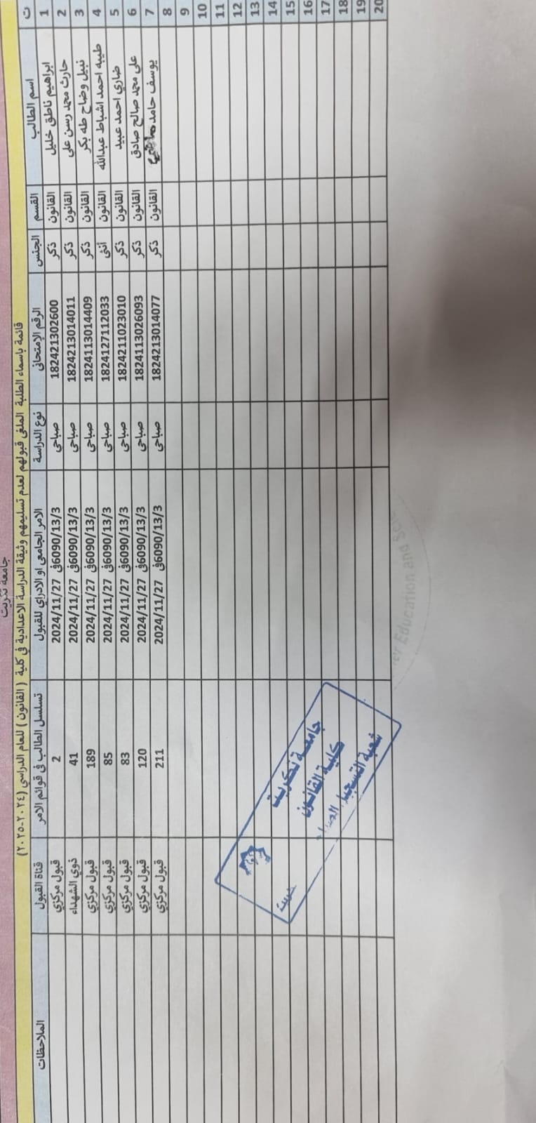 استنادا الى كتاب وزارة التعليم العالي/ دائرة الدراسات والتخطيط والمتابعة ذي العدد ت م ٥ / ١١س /٤٤٧٠ في ١٥ /١٢/ ٢٠٢٥ على الراغبين بالعودة إلى مقاعد الدراسة من الطلبة الملغي قبولهم للعام الدراسي ٢٠٢٤-٢٠٢٥ لعدم تسليمهم وثيقة الدراسة الاعدادية والواردة أسماؤهم في الجداول أدناه مراجعة شعبة التسجيل مستصحبين وثيقة الدراسة الاعدادية الاصلية معنونة إلى كلية القانون / جامعة تكريت وخلال موعد اسبوع من تأريخ نشر الإعلان.