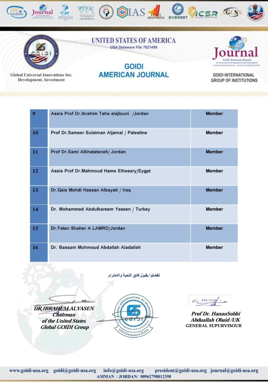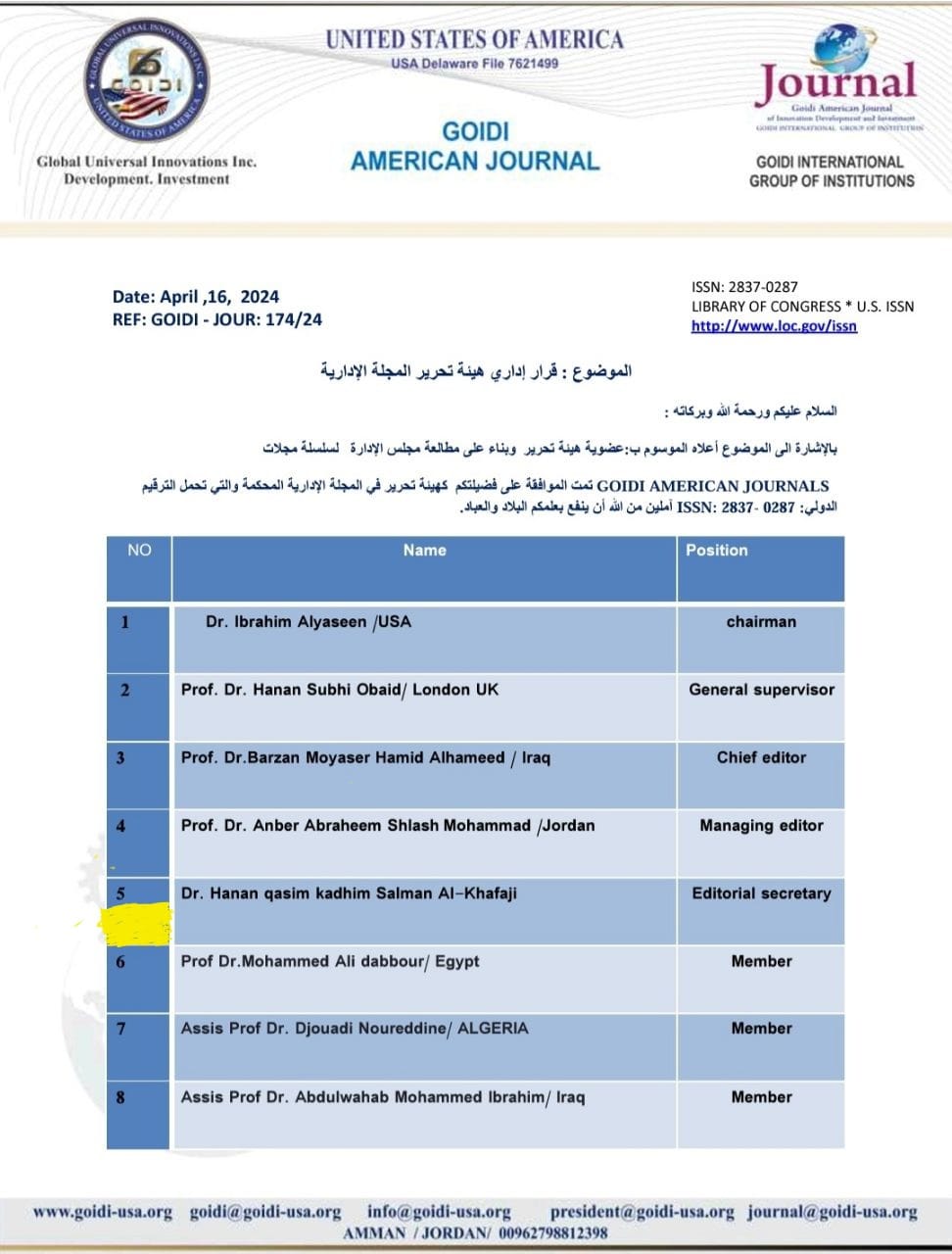 تم اختيار الدكتوره ( حنان قاسم كاظم الخفاجي) ، عضوا هيئة تحرير وسكرتير مدير التحرير في (المجلة الادارية الامريكية المحكمة)؛ والتي تنتمي لسلسلة مجلات مجلات ((GOIDI AMERICAN JOURNALS والتي تحمل الترقيم الدولي( 0287 - 2837 :ISSN) ،.وذلك نظرا لسمعتها العلمية المرموقة، ولاختصاصها في قانون العمل والضمان الاجتماعي الذي يعد من الاختصاصات النادرة على المستوى الوطني والدولي.
