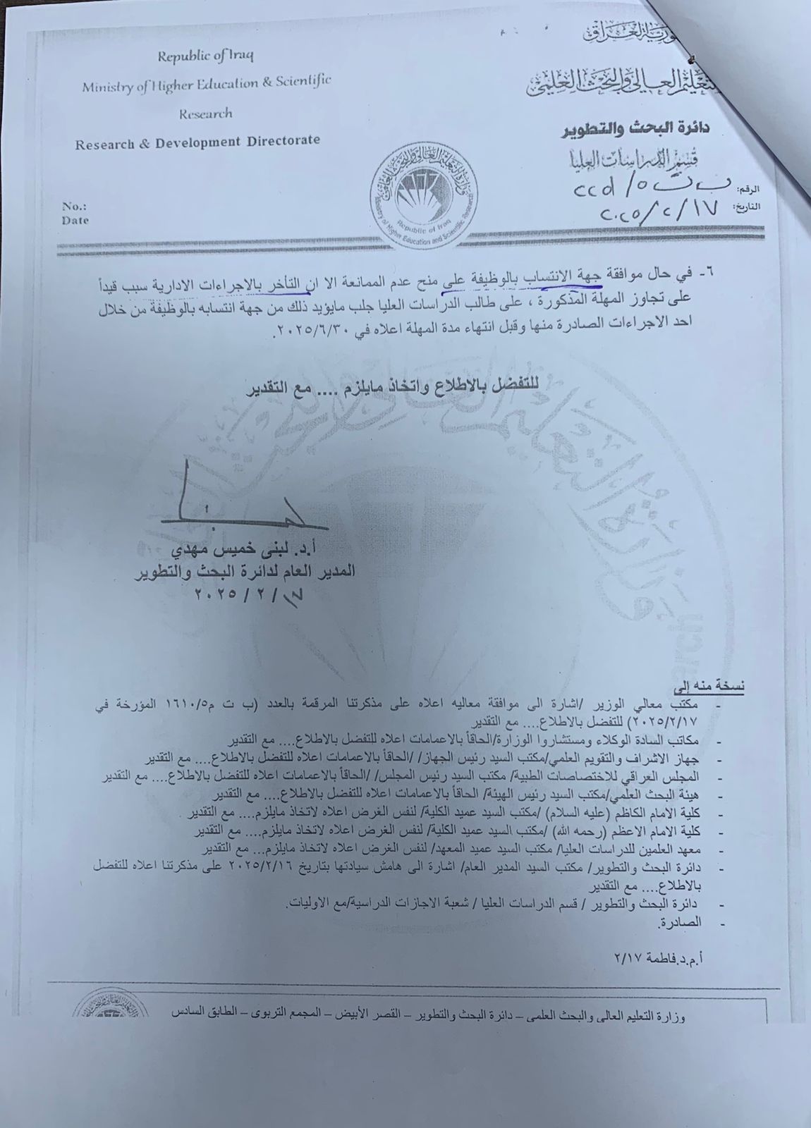 اشارة الى كتاب وزارة التعليم العالي والبحث العلمي ذي العدد (ب ت ٢٢٥١/٥ في ١٧/٢/٢٠٢٥) المتضمن حسم حالات طلبة الدراسات العليا من المعينيين لسنة ٢٠٢٤ ،راجين من طلبة الدراسات العليا الذين تم تعيينهم جلب كتاب عدم ممانعة للكلية علماً ان اخر موعد هو (٣٠/٦/٢٠٢٥) بخلاف ذلك يتم تخيير الطالب بين (الوظيفة او الدراسة) وتنتهي علاقتهم بالدراسة لعدم تحمل الاثار المترتبة على استمرارهم بالدراسة مع عدم حصولهم على عدم الممانعة او كتاب عدم التعارض كما هو مبين في كتاب الوزارة ادناه .