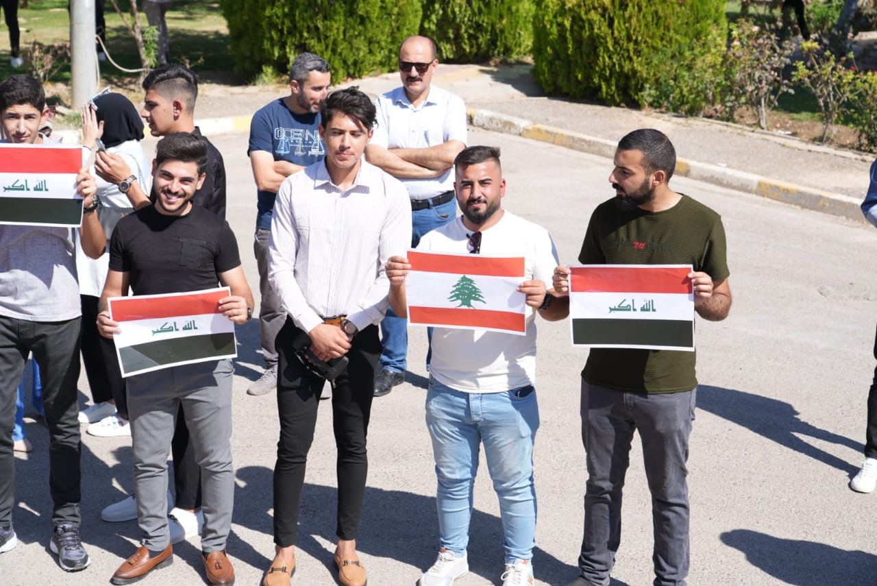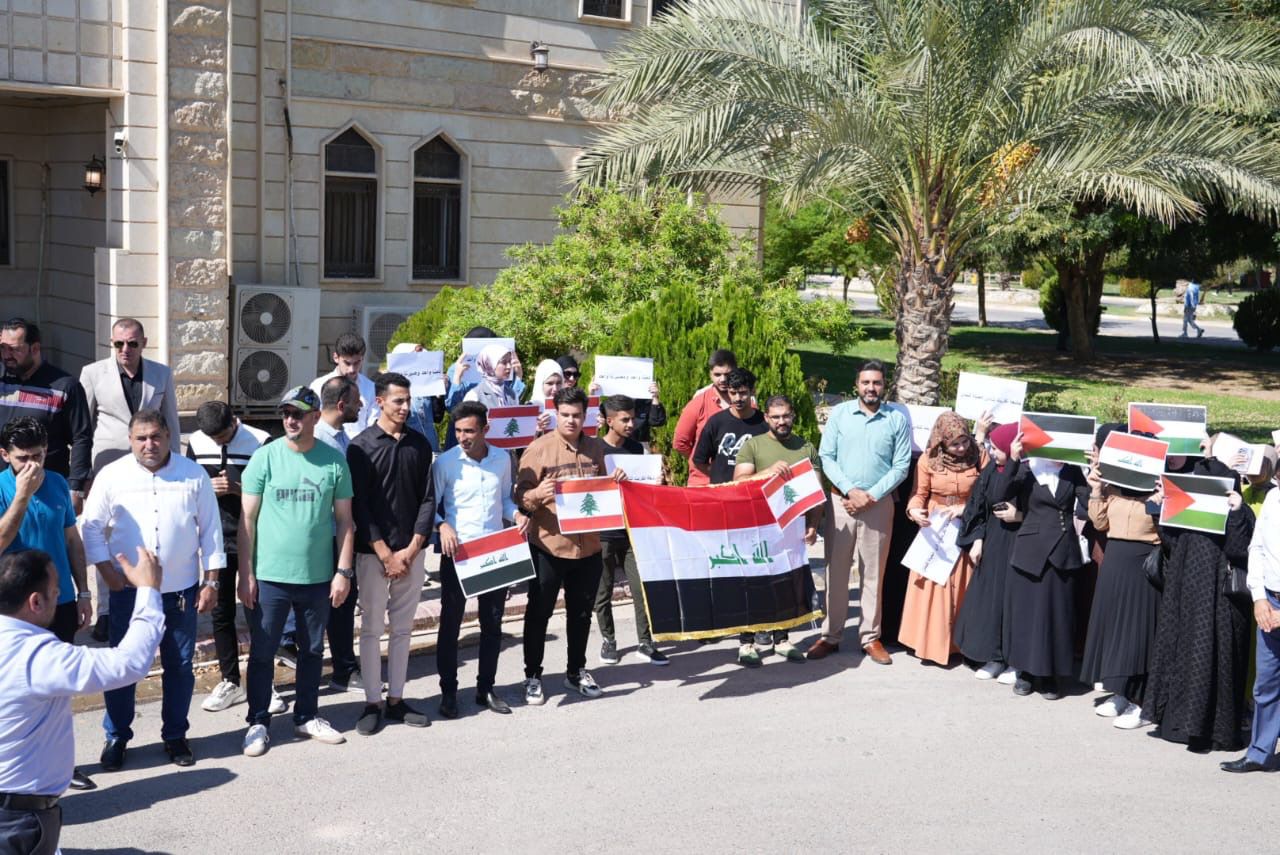 تنفيذا لتوجيهات وزارة التعليم العالي والبحث العلمي نظمت جامعة تكريت بحضور الاستاذ الدكتور وعد محمود رئيس جامعة تكريت والاستاذ الدكتور حسن حسين ابراهيم مساعد رئيس الجامعة للشؤون العلمية وعدد من السادة عمداء الكليات والموظفين والطلبة وقفة استنكارية واحتجاجية ضد العدوان الهمجي الذي يتعرض له الشعبين الفلسطيني واللبناني الشقيقيين على يد قوى الاحتلال والظلام وشهدت الوقفة حمل الاعلام العراقية والعلمين الفلسطيني واللبناني وشعارات التنديد والاستنكار لجرائم العدو الذي زاد في طغيانه وهمجيته وتجاهله لكافة الاعراف والمواثيق الدولية والانسانية واقترافه الجرائم ضد العرب والمسلمين هذا ودان الحاضرون الانتهاكات الكبيرة لحقوق الإنسان التي يتعرض لها الشعبين الشقيقين كما وتمت الدعوة الى ضرورة وقوف المجتمع الدولي والمنظمات الحقوقية في العالم لاخذ دورها لصد مثل هذه الاعتداءات الغاشمة يذكر ان جامعة تكريت قد نظمت العديد من الوقفات الاستنكارية في اوقات سابقة دعما للاشقاء والمستضعفين في العالم.