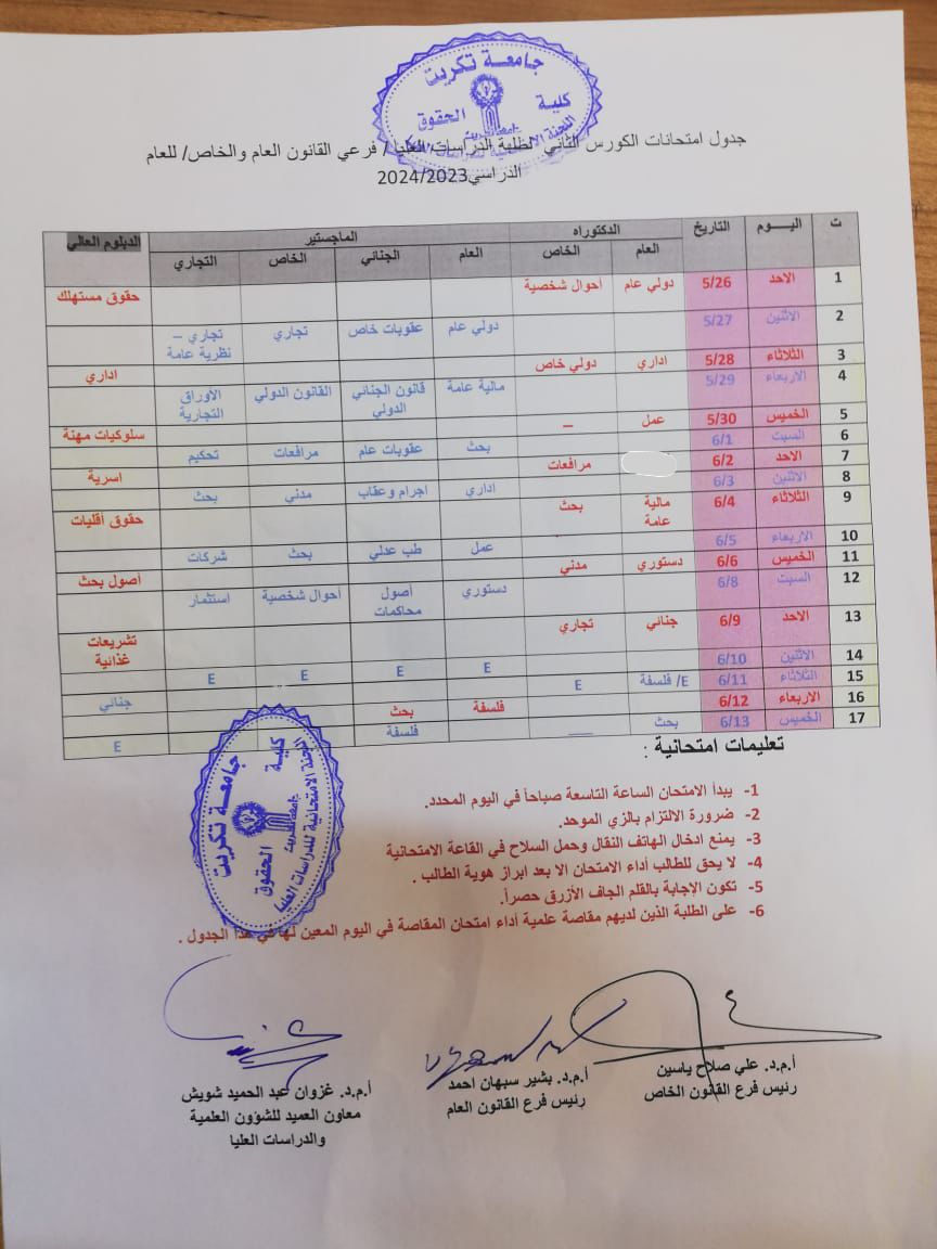 🟣جدول امتحانات الكورس الثاني لطلبة الدراسات العليا لفرعي القانون الخاص والقانون العام للعام الدراسي 2023-2024.