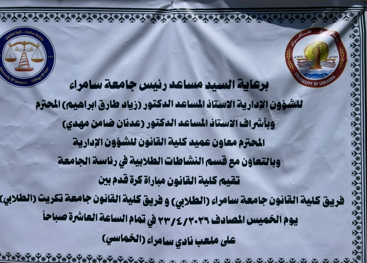 انطلاقاً من مبدأ التعاون العلمي والرياضي بين الجامعات العراقية وبدعم مباشر من عمادة كلية القانون والمتمثلة بالسيد عميد الكلية الأستاذ الدكتور نايف أحمد ضاحي وباشراف من شعبة النشاطات الطلابية بكليتنا اقيمت في يوم الخميس الموافق ٢٠٢٦/٤/٢٣ مباراة كرة قدم طلابية بين فريق كلية القانون جامعة تكريت وفريق كلية القانون جامعة سامراء وعلى رحاب ملعب نادي سامراء الرياضي وقد انتهت المباراة بفوز فريق كليتنا بنتيجة (٢-٠) وقد سادت أجواء المباراة التنافس والروح الرياضية بين الفريقين واكد الجانبان على استمرار التعاون العلمي والثقافي والرياضي بين الكليتين .