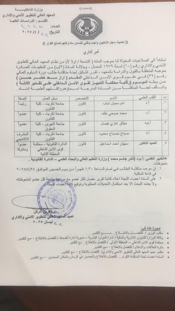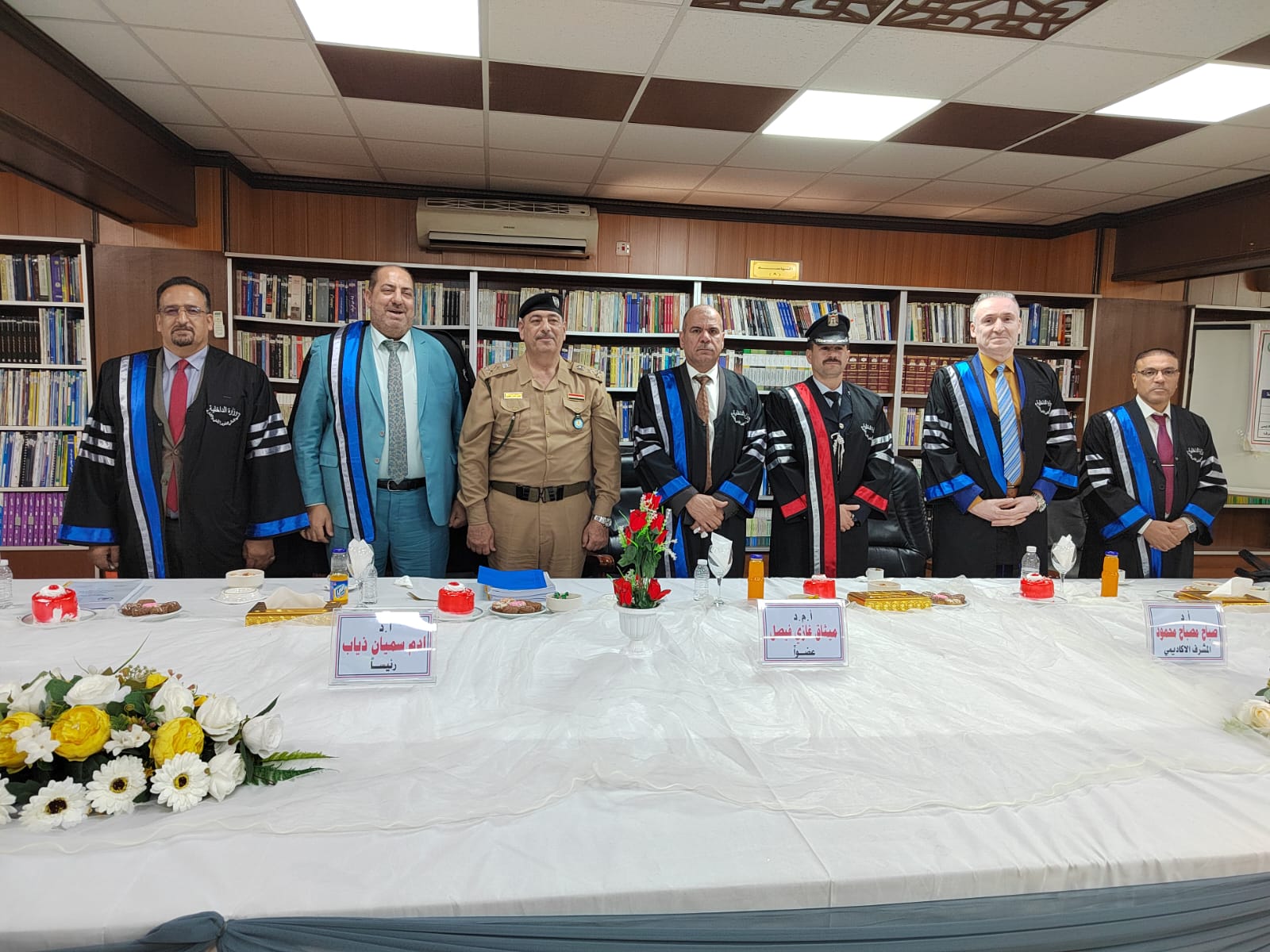 شارك الاستاذ الدكتور صباح مصباح محمود والاستاذ الدكتور ادم سميان ذياب والاستاذ الدكتور محمد صبحي خلف والاستاذ المساعد الدكتور ميثاق غازي فيصل التدريسي على ملاك كليتنا لجنة مناقشة بحث دبلوم عالي في المعهد العالي والموسومة ب "رقابة محكمة التمييز لقوى الأمن الداخلي على تقدير الادلة" للطالب (اراز سعد خضر حسن) .