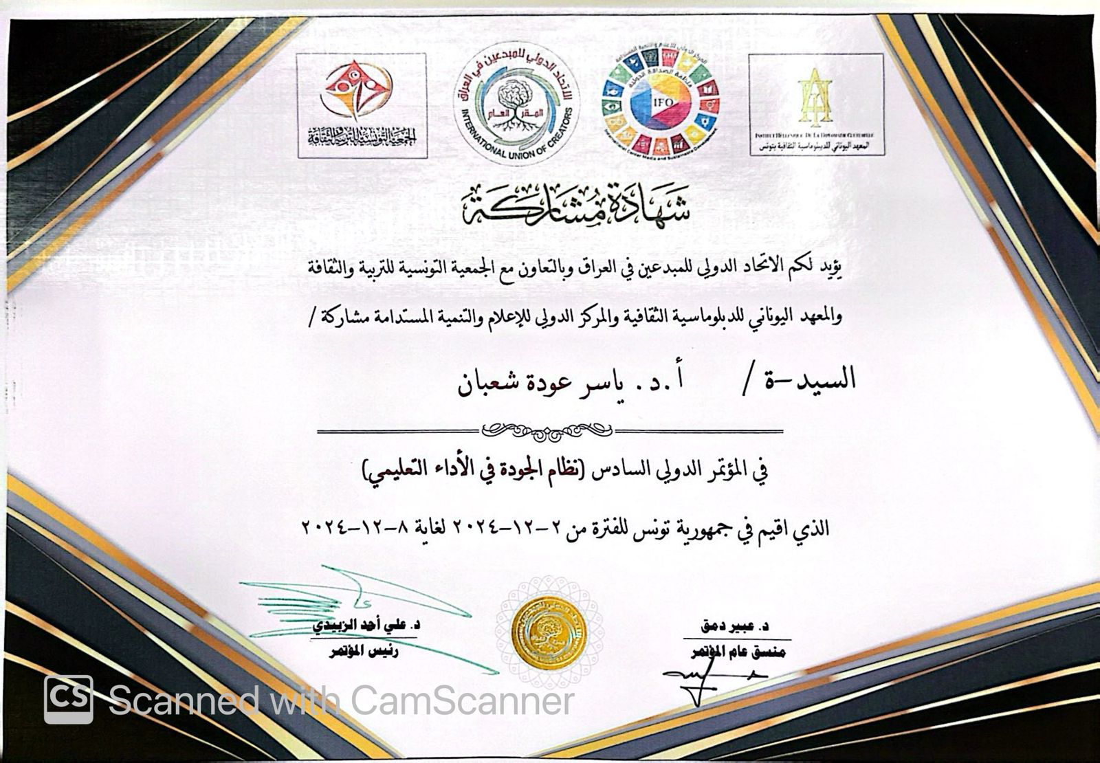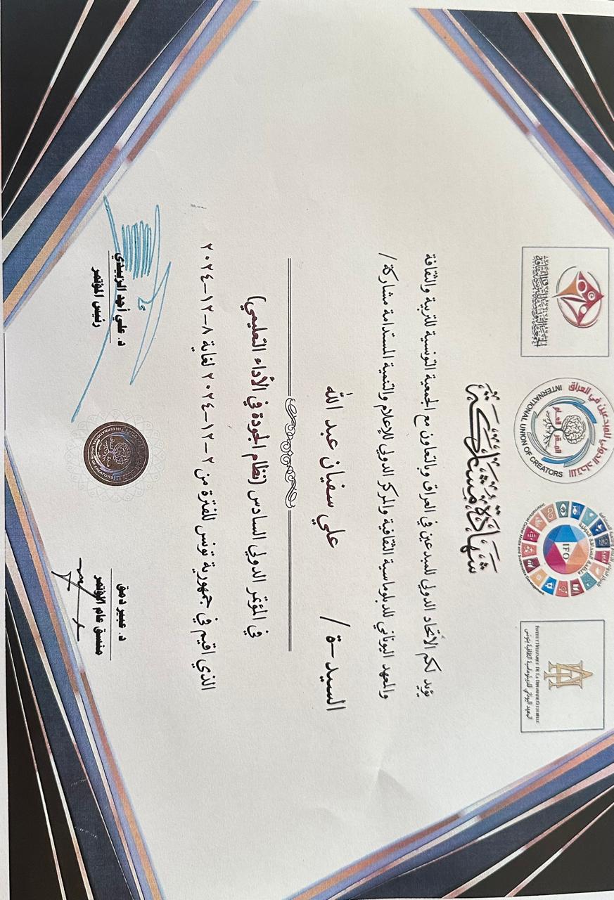 شارك كل من الاستاذ الدكتور أدم سميان ذياب والاستاذ الدكتور ياسر عواد شعبان والاستاذ المساعد علي سفيان عبدالله من التدريسيين على ملاك كليتنا في المؤتمر الدولي السادس "نظام الجودة في الاداء التعليمي" الذي اقامته مؤسسة منار للتنمية والتعليم في جمهورية تونس العربية للفترة 2-8/ 12/ 2024 وبالتعاون مع الجمعية التونسية للتربية والثقافة والمعهد اليوناني للدبلوماسية الثقافية والمركز الدولي للاعلام والتنمية المستدامة ، سائلين المولى عز وجل ان يوفق الجميع بما فيه خيراً للعراق وسموه.