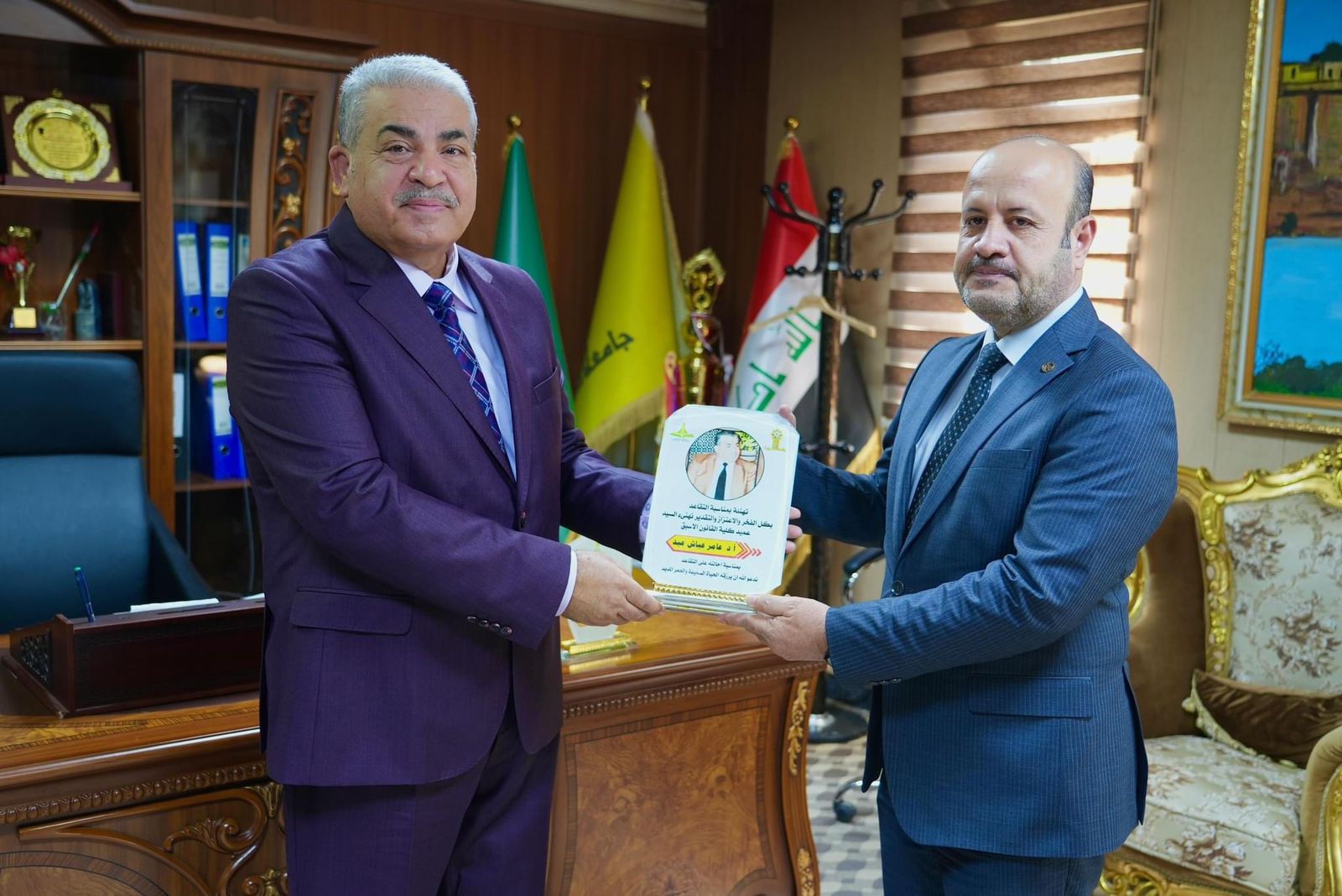 ترأس الاستاذ الدكتور وعد محمود رؤوف رئيس جامعة تكريت يوم الاربعاء الموافق ٢٣/ ١٠/ ٢٠٢٤ مجلس كلية القانون من موقع ادنى وتم في بداية الاجتماع تكريم الاستاذ الدكتور عامر عياش العميد السابق لكلية القانون واحد مؤسسيها بمناسبة احالته على التقاعد حيث تم تقديم كتاب شكر وتقدير له مع اشادة المجلس به وبدوره في النهوض بالكلية والواقع القانوني بالمحافظة