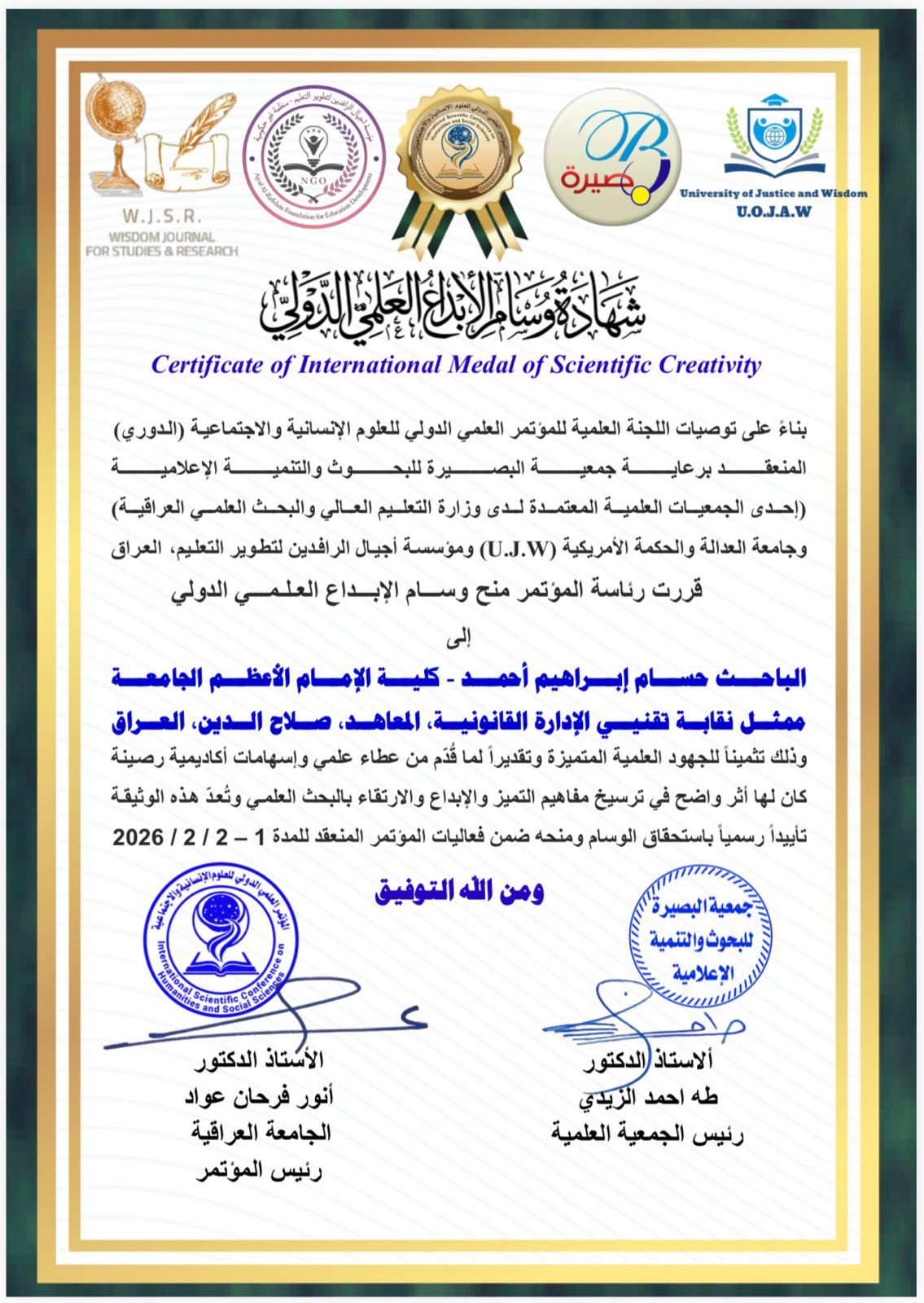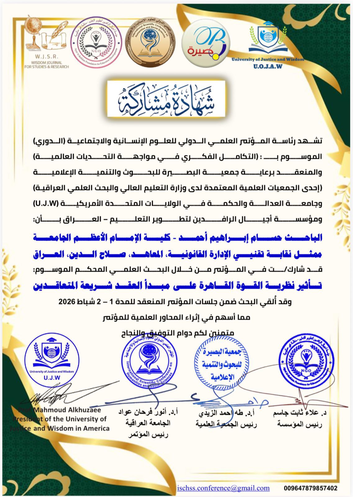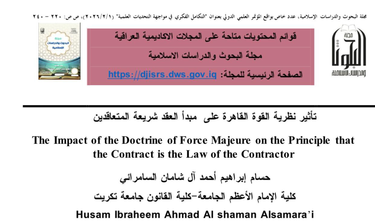 نشر الطالب حسام إبراهيم أحمد آل شامان السامرائي، من المرحلة الرابعة /الدراسة المسائية في كلية القانون - جامعة تكريت، بحثًا علميًا بعنوان: ( تأثير نظرية القوة القاهرة على مبدأ العقد شريعة المتعاقدين ) في مجلة البحوث والدراسات الإسلامية والإنسانية، إحدى المجلات العلمية المعتمدة لدى وزارة التعليم العالي والبحث العلمي ،في العدد الخاص بواقع المؤتمر العلمي الدولي1-2-2026 ،الذي شغل الصفحات من ( 220-240 )، وتناول البحث موضوعًا مهمًا في نطاق القانون المدني، حيث بحث في أثر القوة القاهرة والظروف الاستثنائية على الالتزامات التعاقدية، ومدى تأثيرها على مبدأ “العقد شريعة المتعاقدين”، بما يسهم في تحقيق التوازن بين استقرار المعاملات وتحقيق العدالة.هذا وقد حصل الطالب على شهادة شكر وتقدير ووسام الابداع والتمييز من المؤتمر العلمي الدولي للعلوم الانسانية والاجتماعية لسنة 2026
