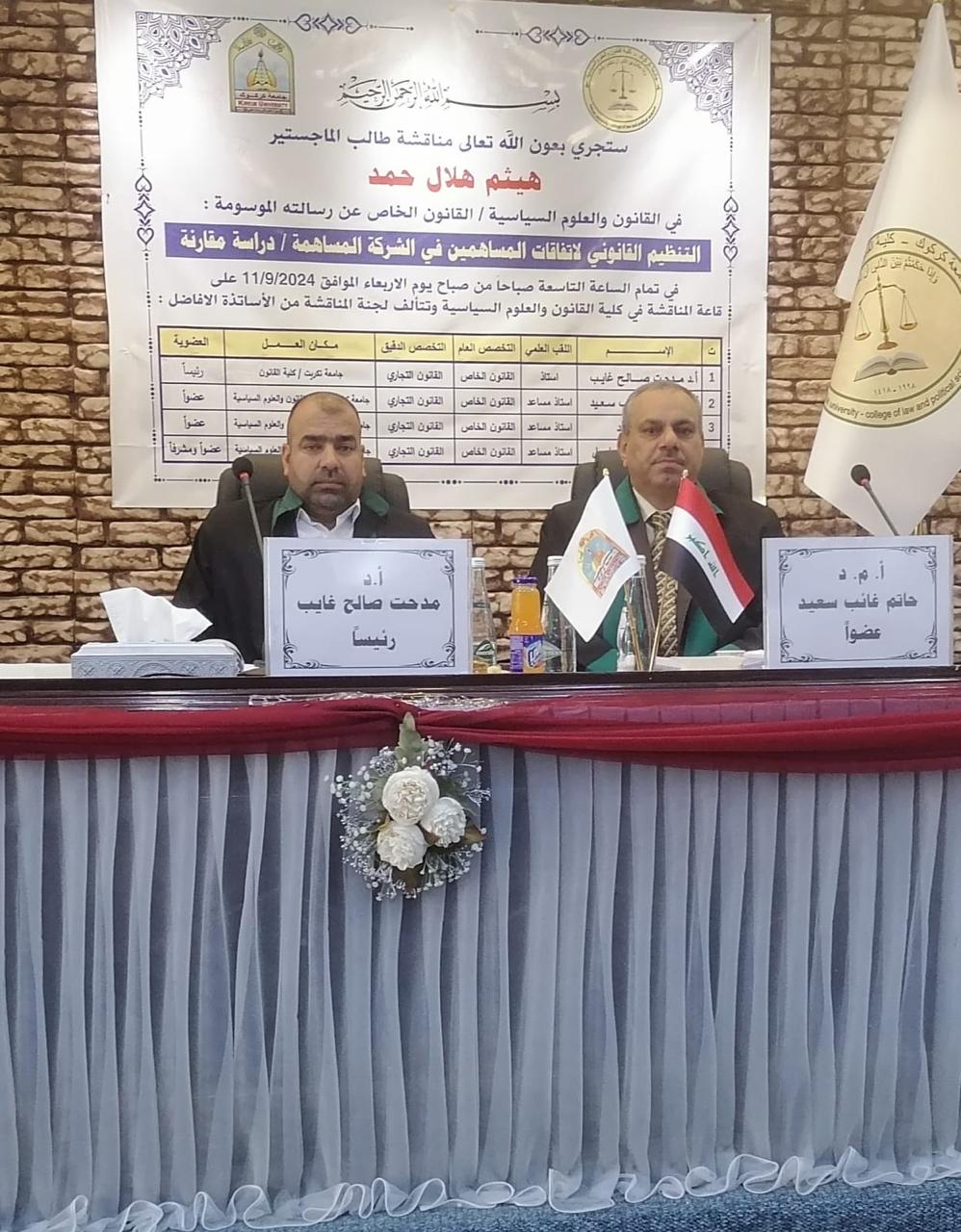 ترأس الاستاذ الدكتور مدحت صالح غايب التدريسي على ملاك كليتنا لجنة مناقشة رسالة ماجستير في كلية القانون والعلوم السياسية بجامعة كركوك والموسومة"التنظيم القانوني لاتفاقات المساهمين في الشركة المساهمة - دراسة مقارنة" للطالب (هيثم هلال حمد خلف) صباح يوم الاربعاء الموافق 11-9-2024 .